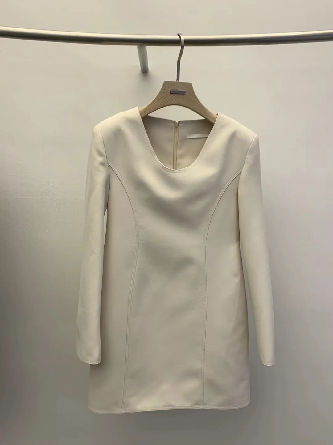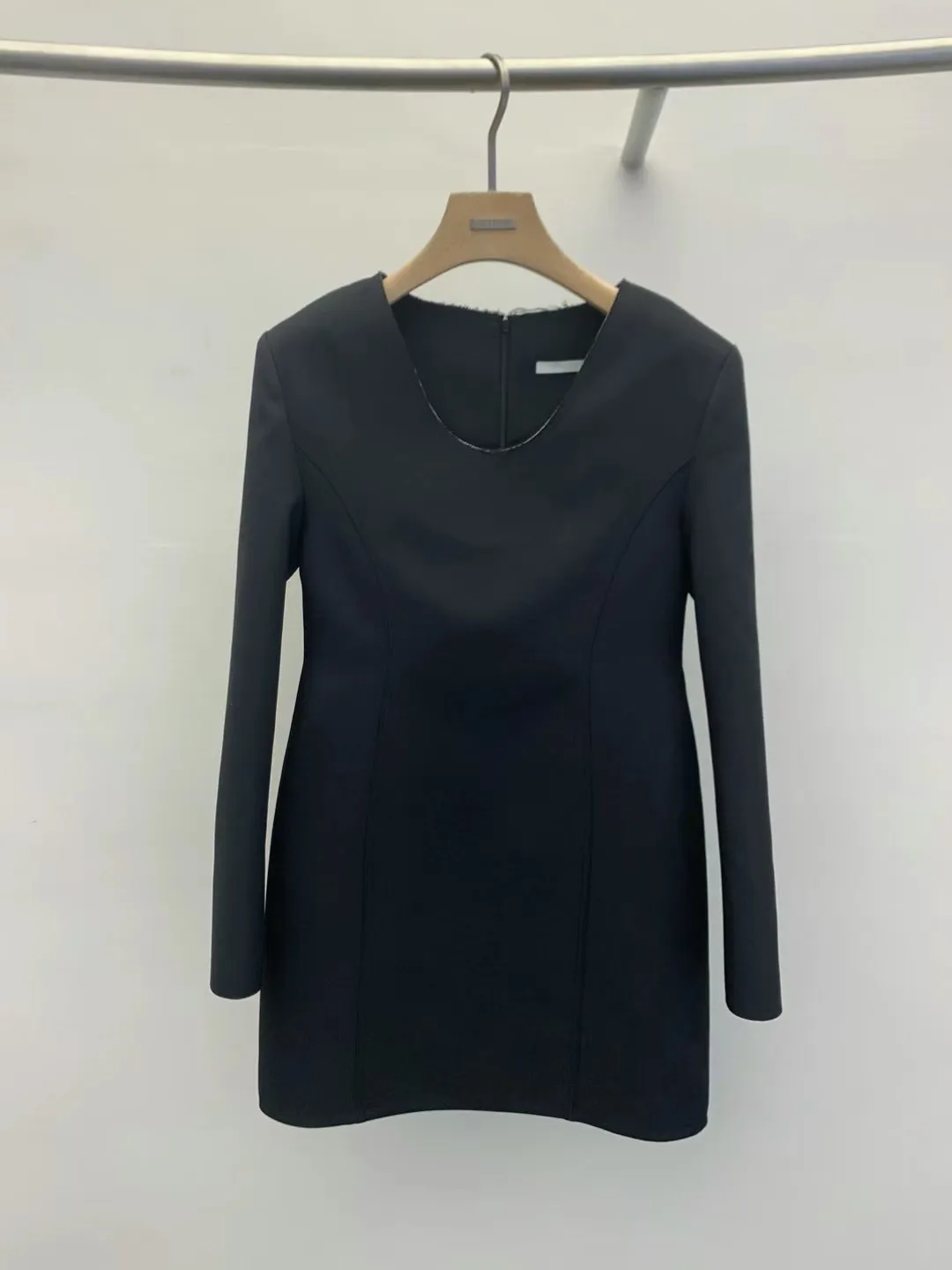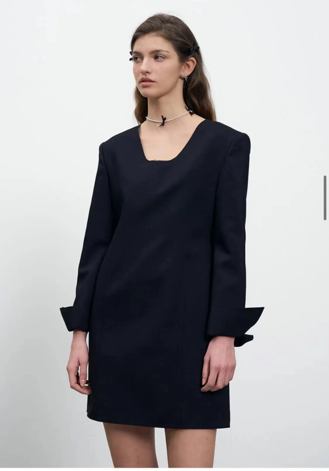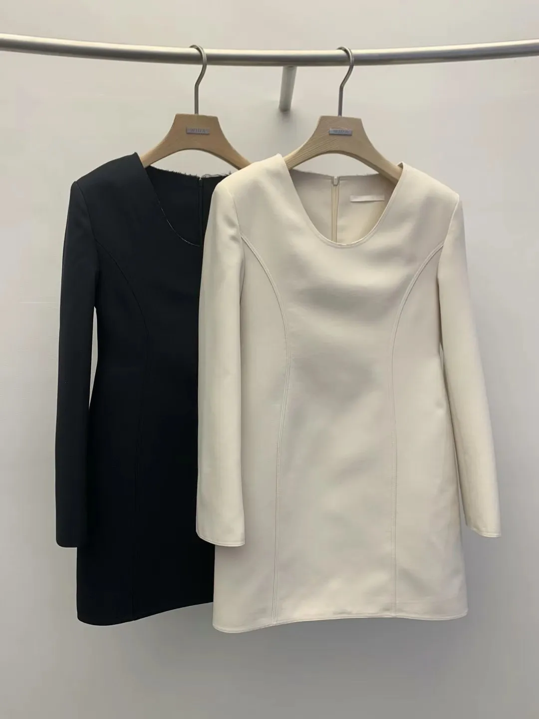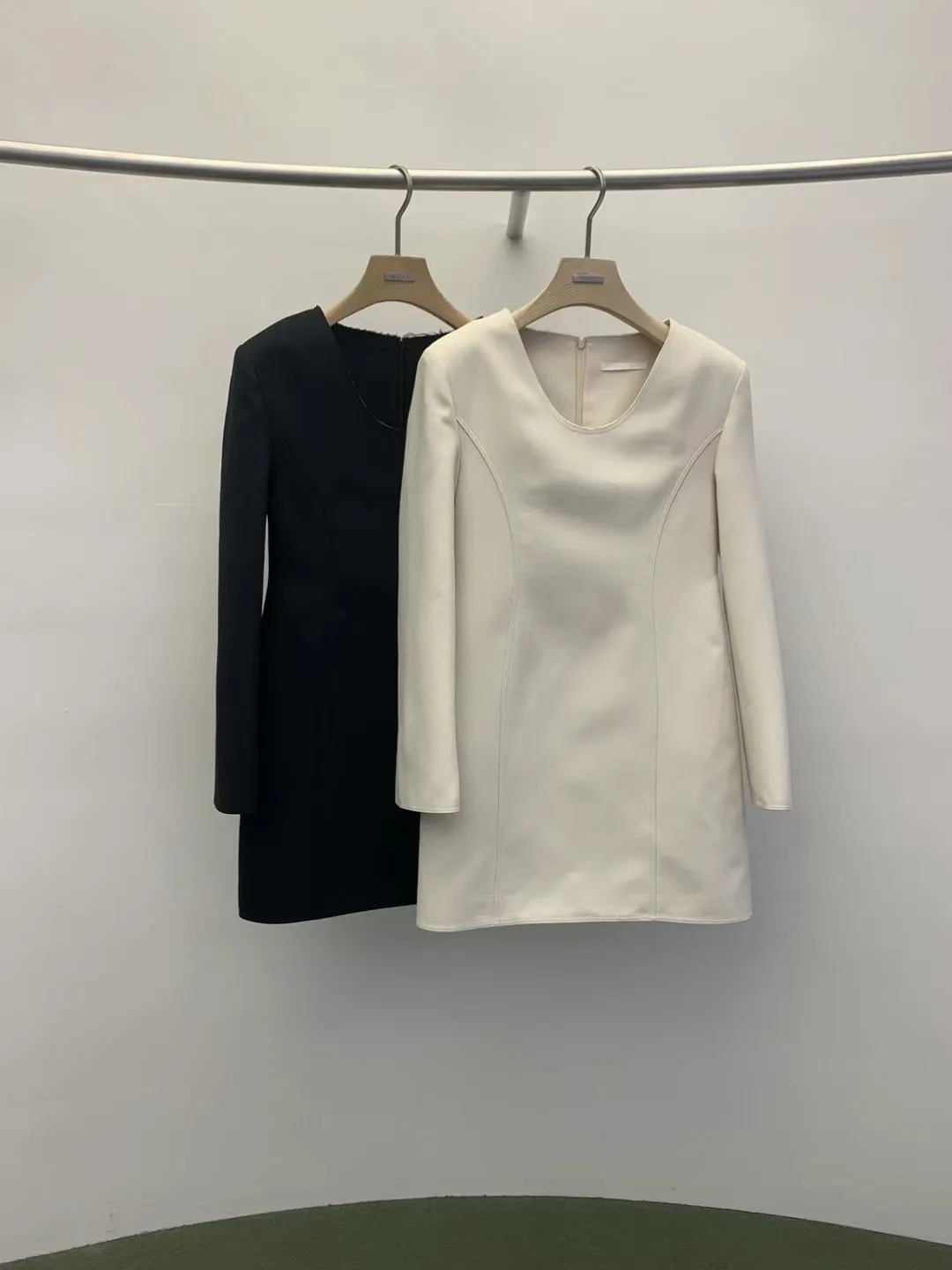 高端設計師品牌 氣質簡約U領顯瘦收腰長袖連衣裙