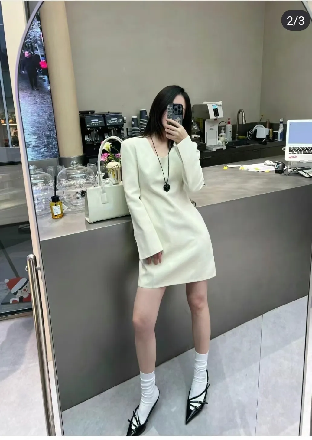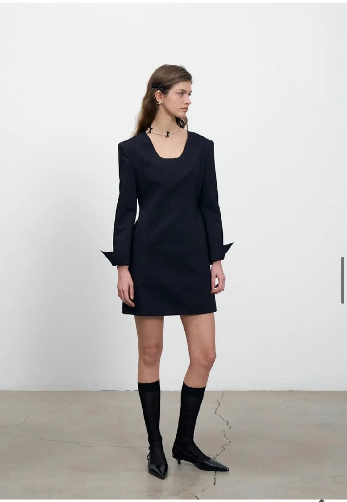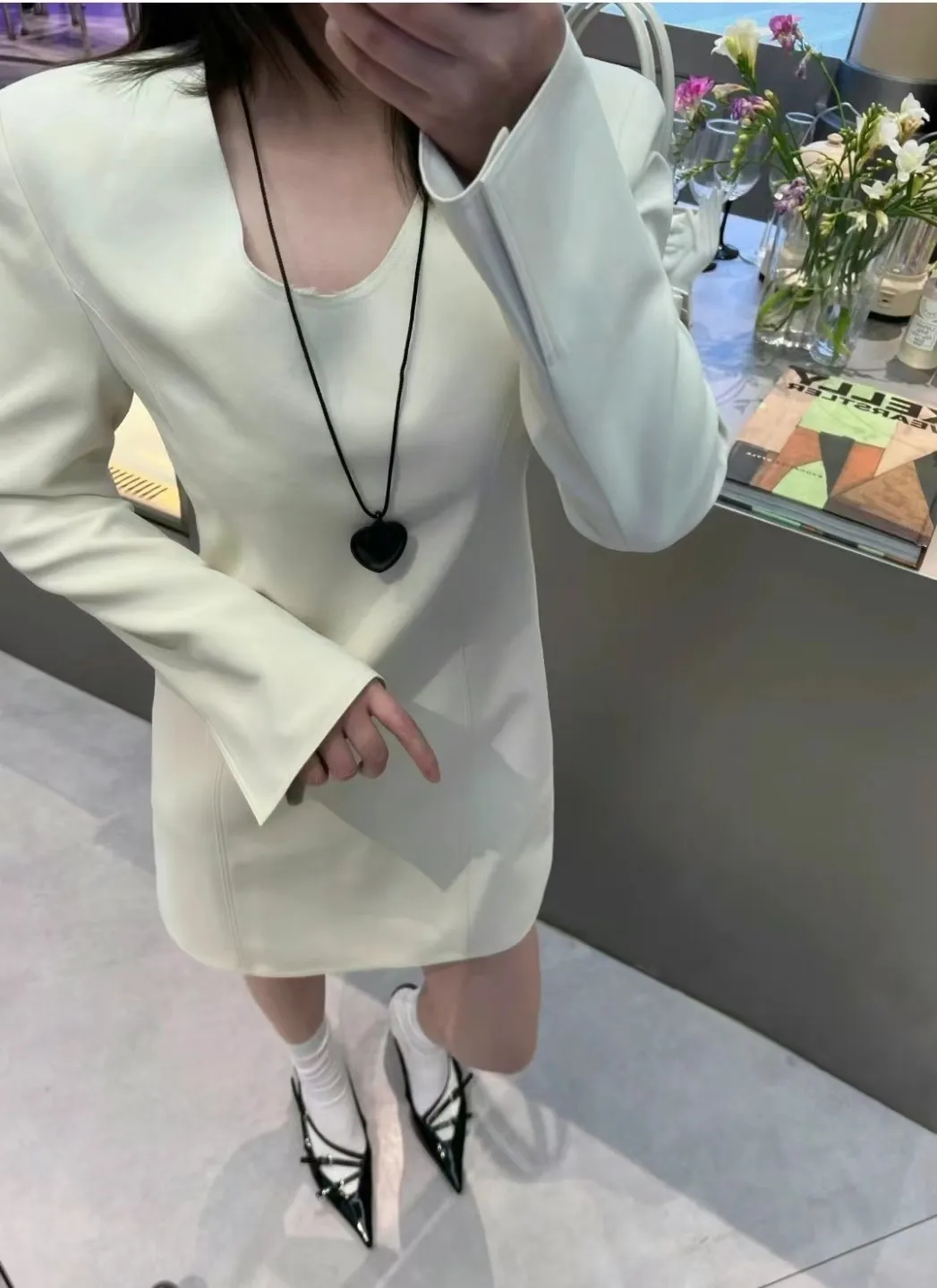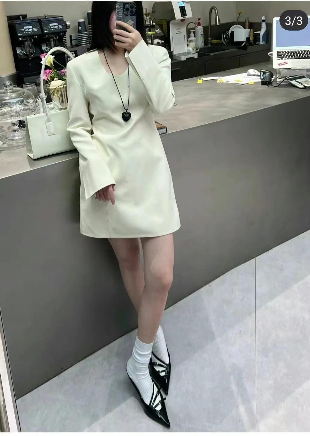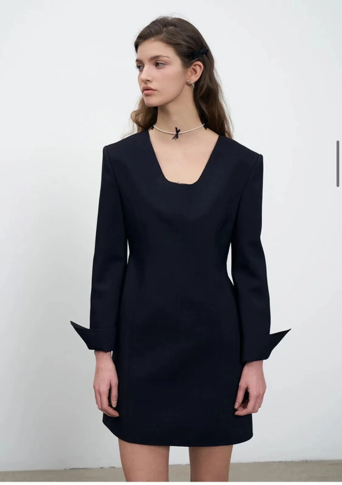 高端設計師品牌 氣質簡約U領顯瘦收腰長袖連衣裙
