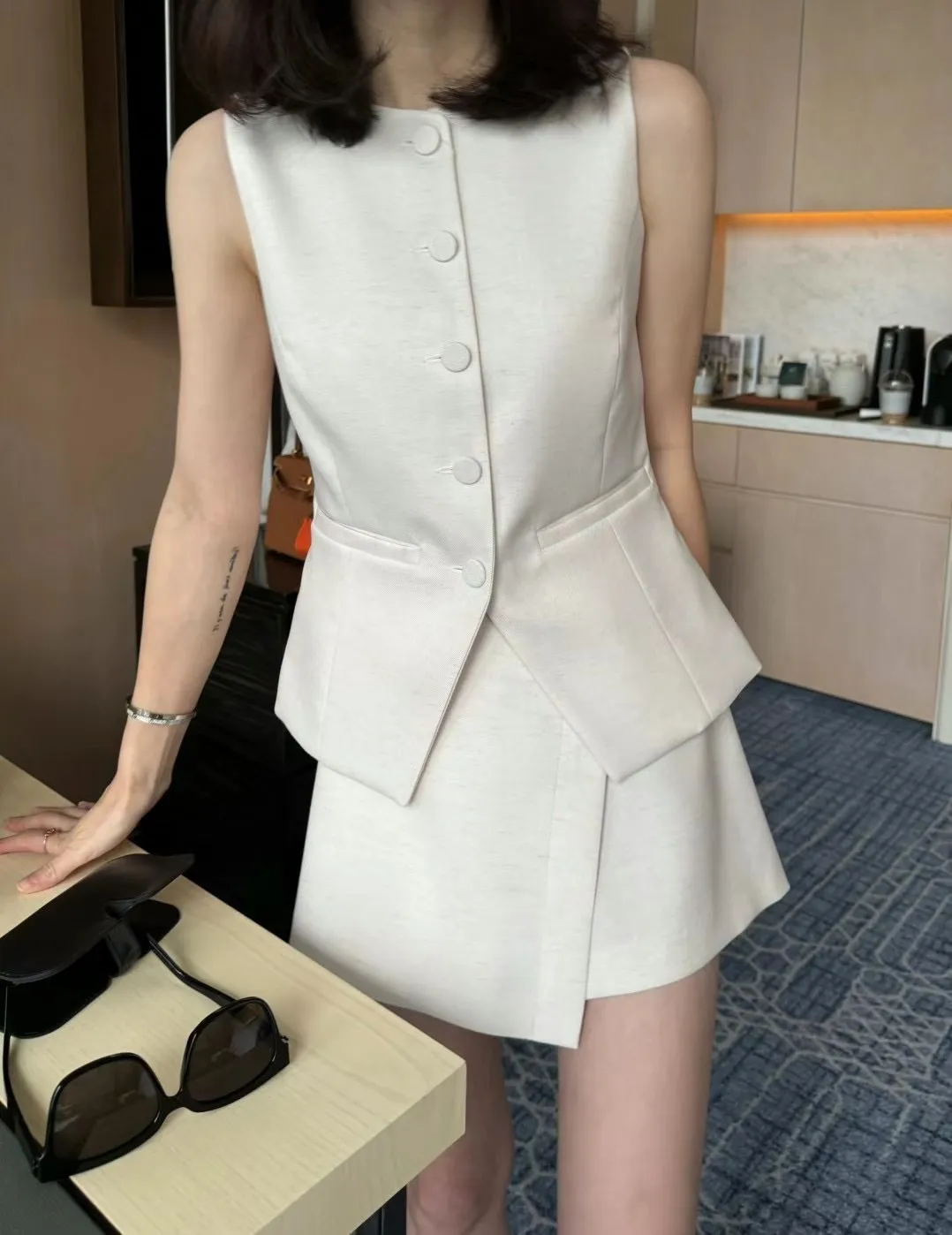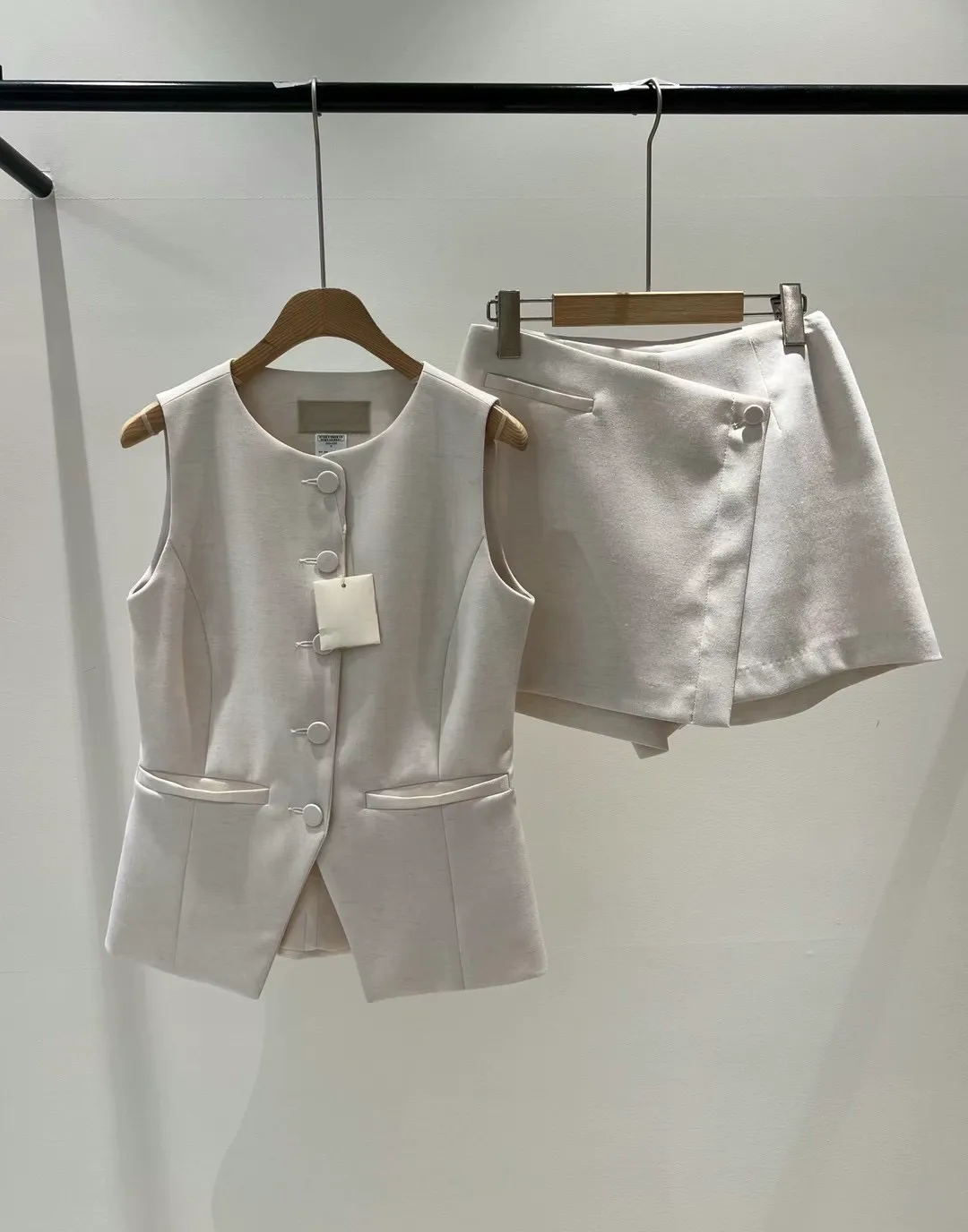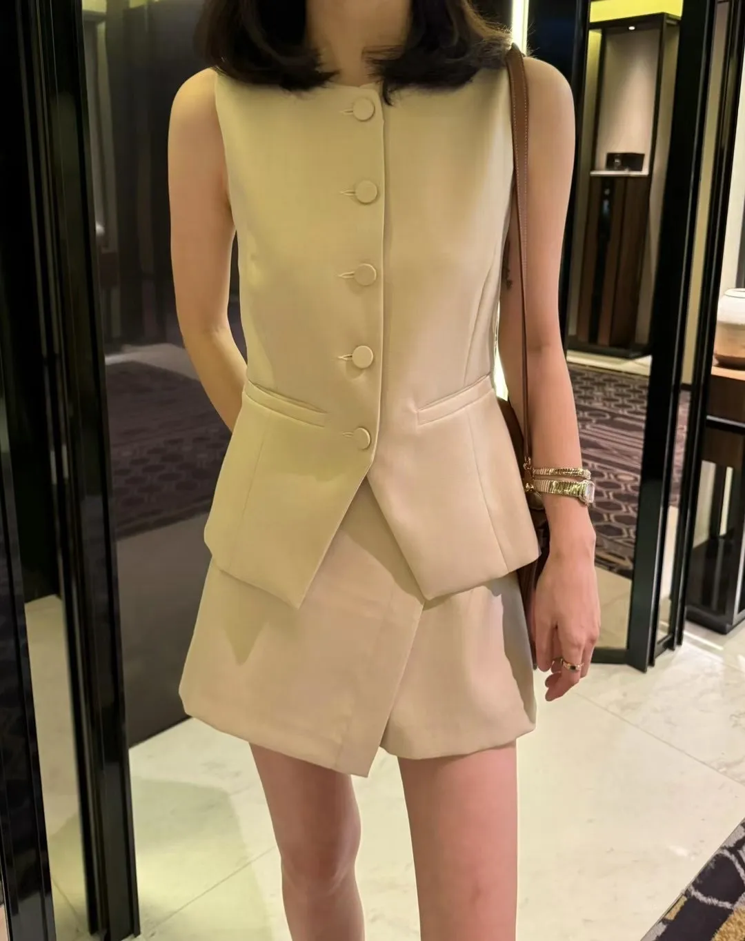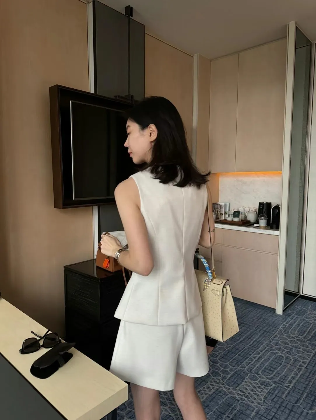都市白領氣質套裝 - 顯瘦無袖上衣與高腰短褲裙(西裝套裝)set