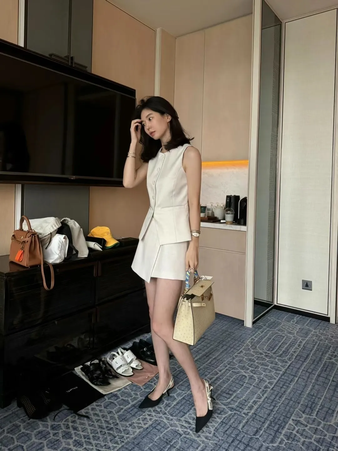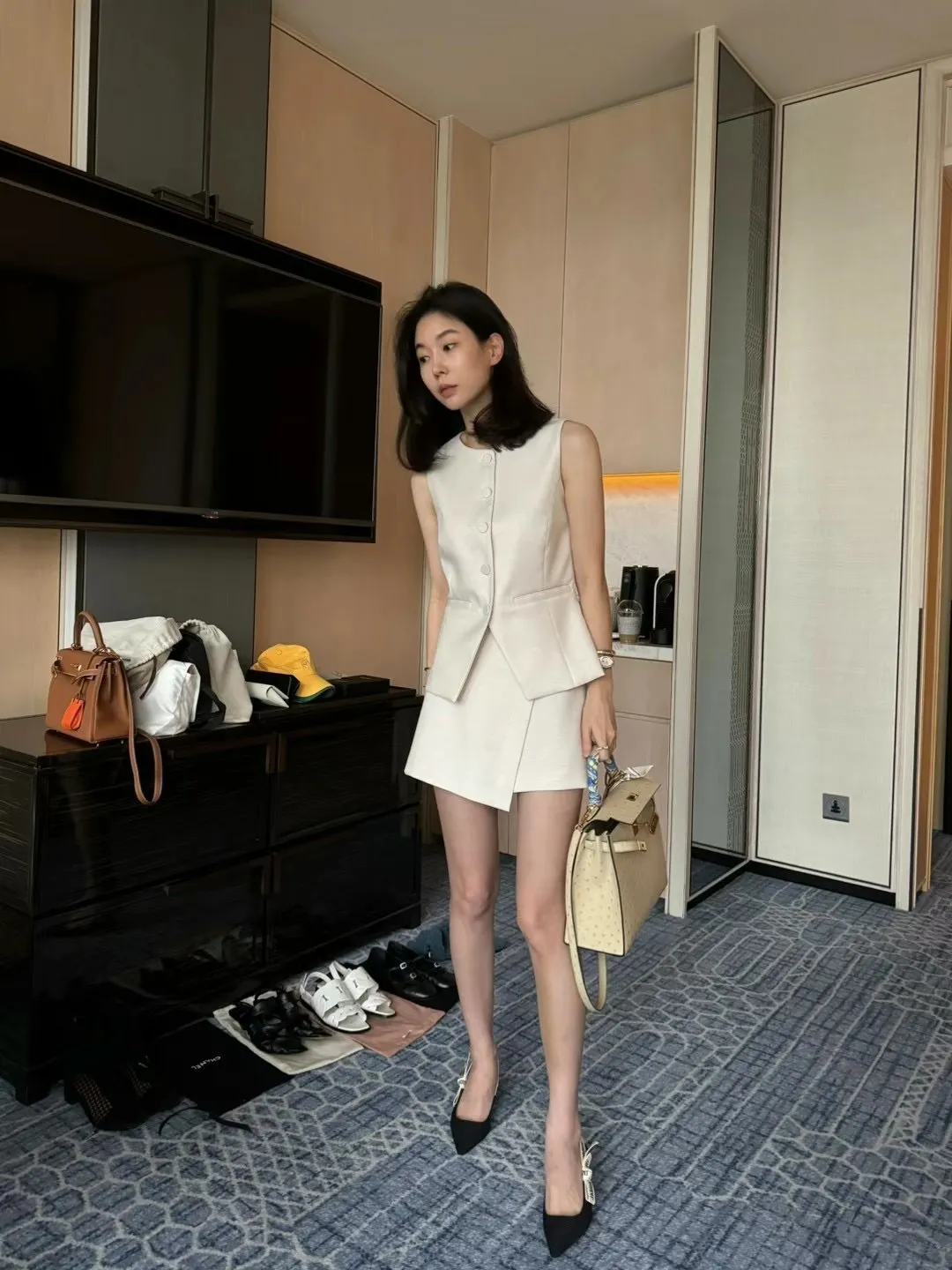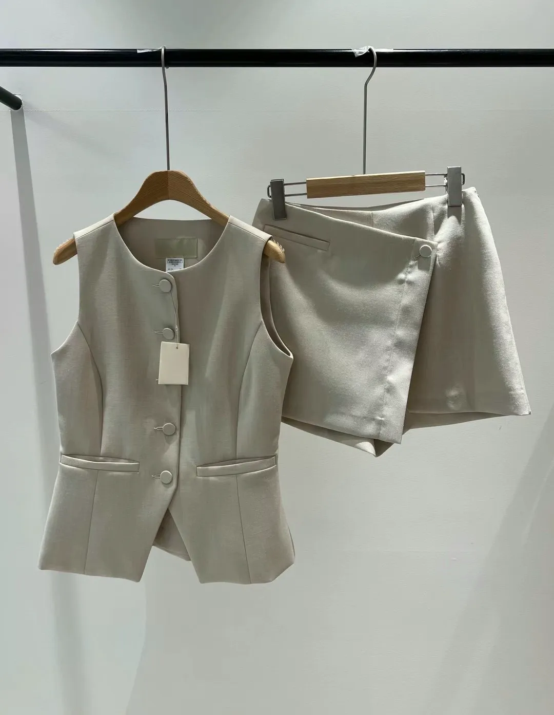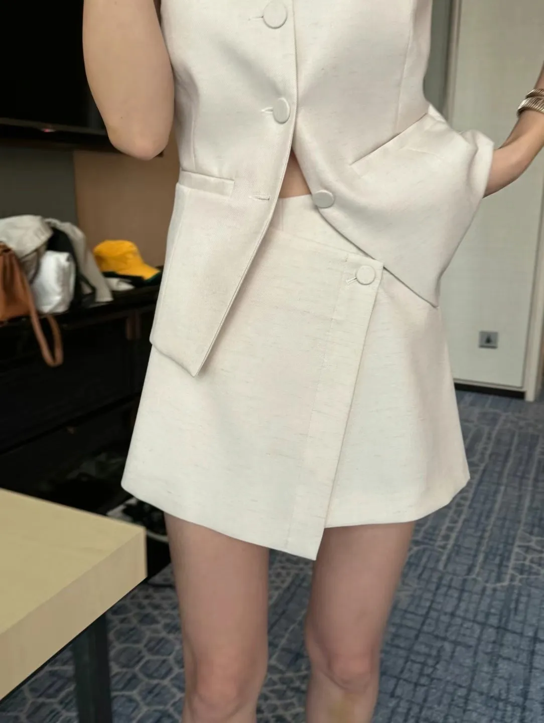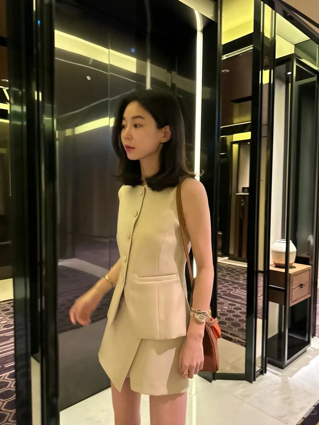 都市白領氣質套裝 - 顯瘦無袖上衣與高腰短褲裙(西裝套裝)set