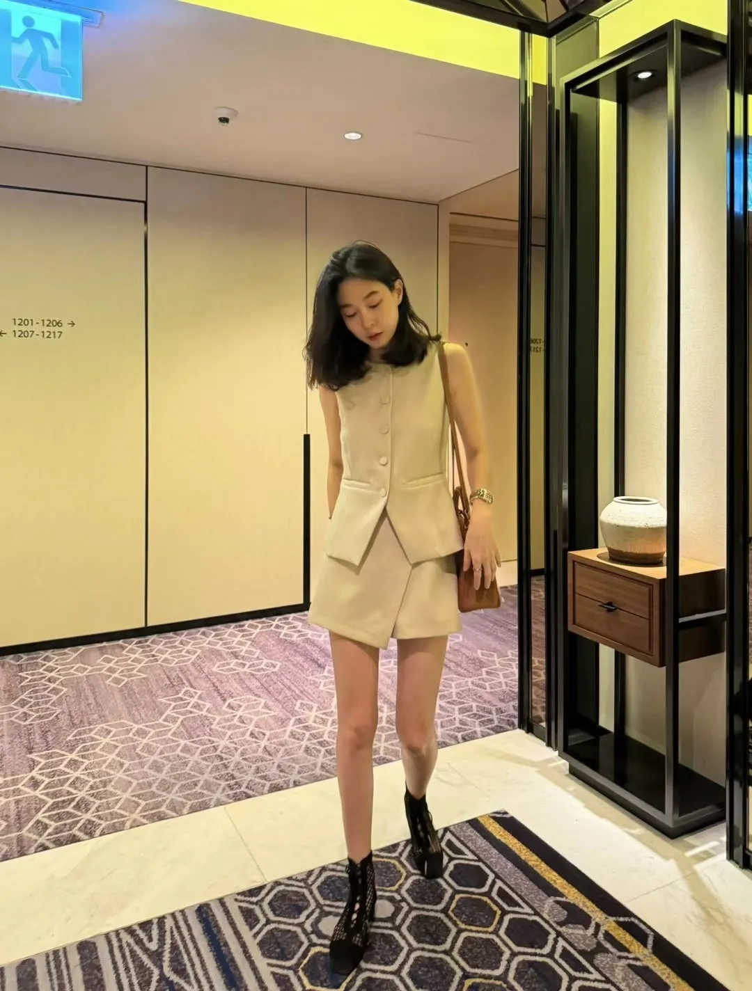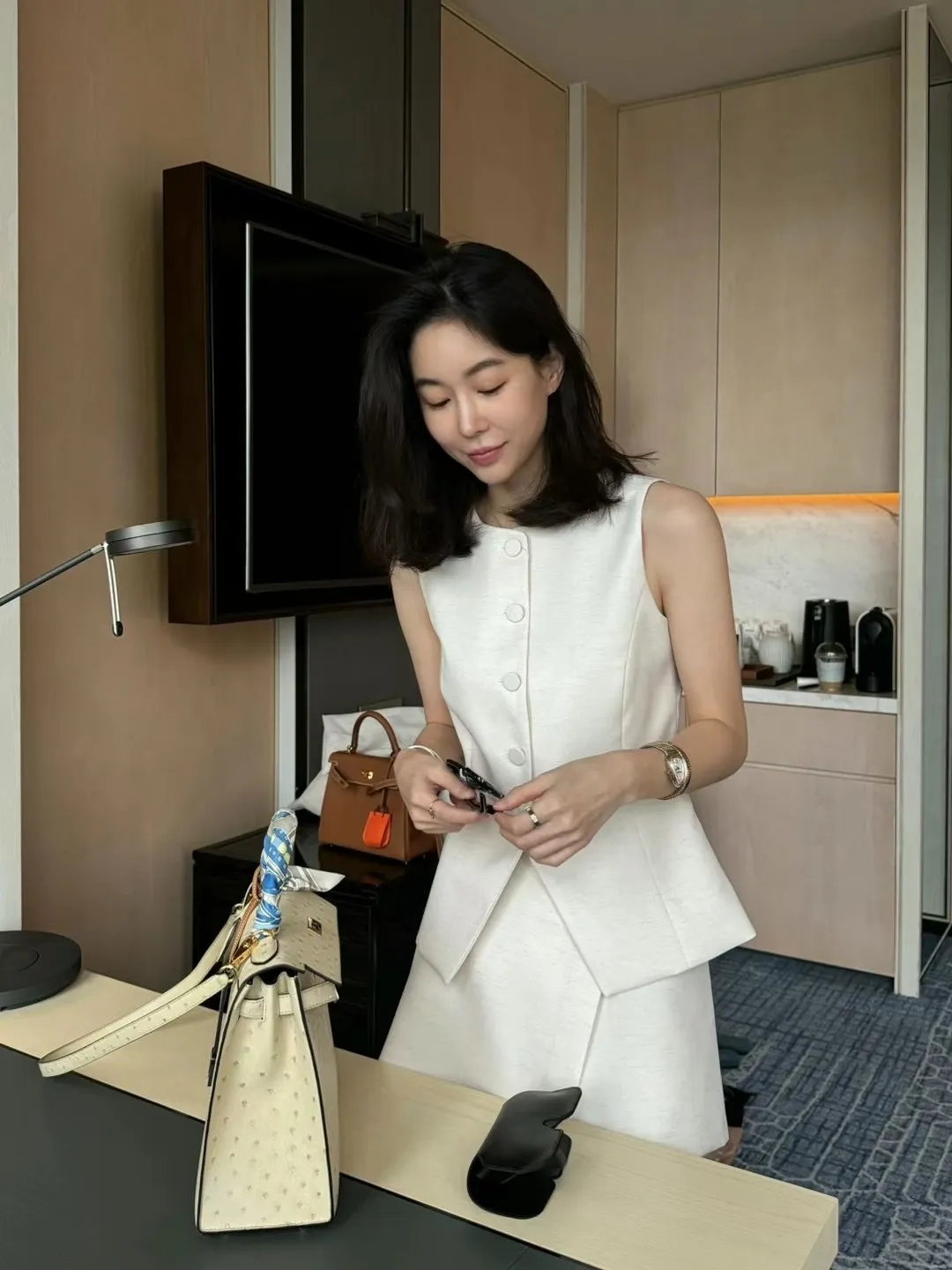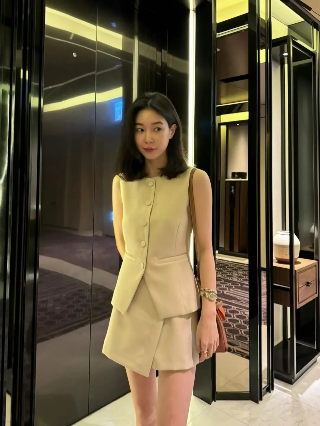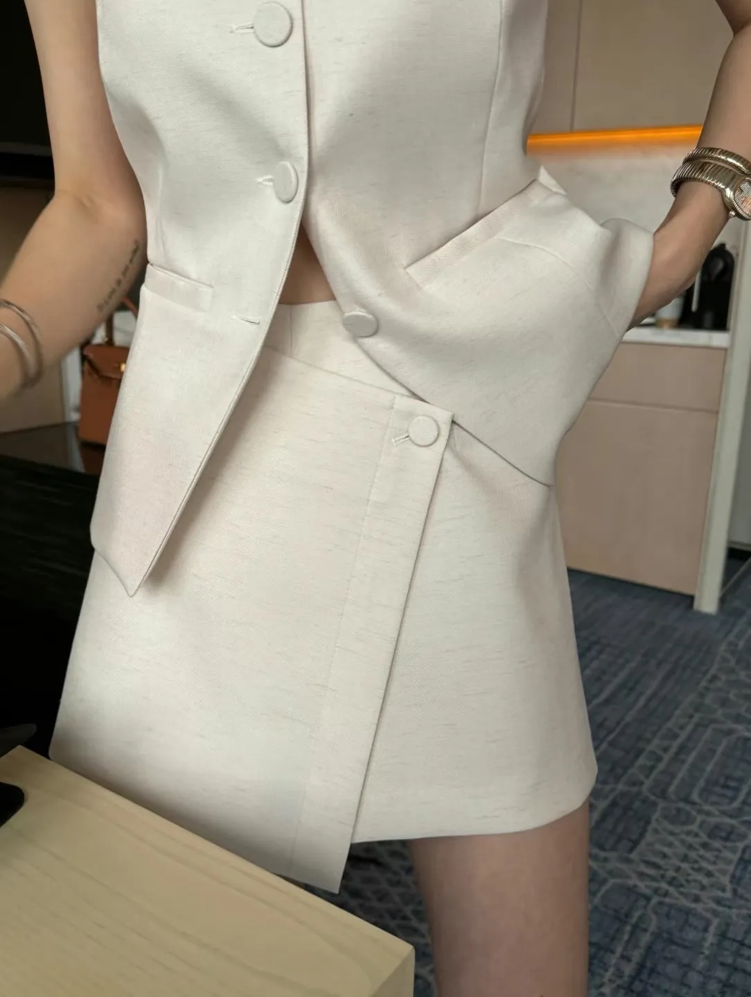 都市白領氣質套裝 - 顯瘦無袖上衣與高腰短褲裙(西裝套裝)set