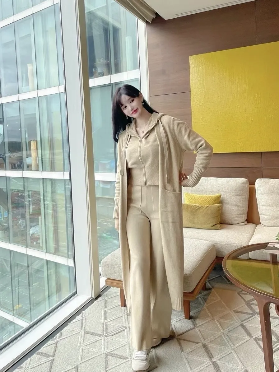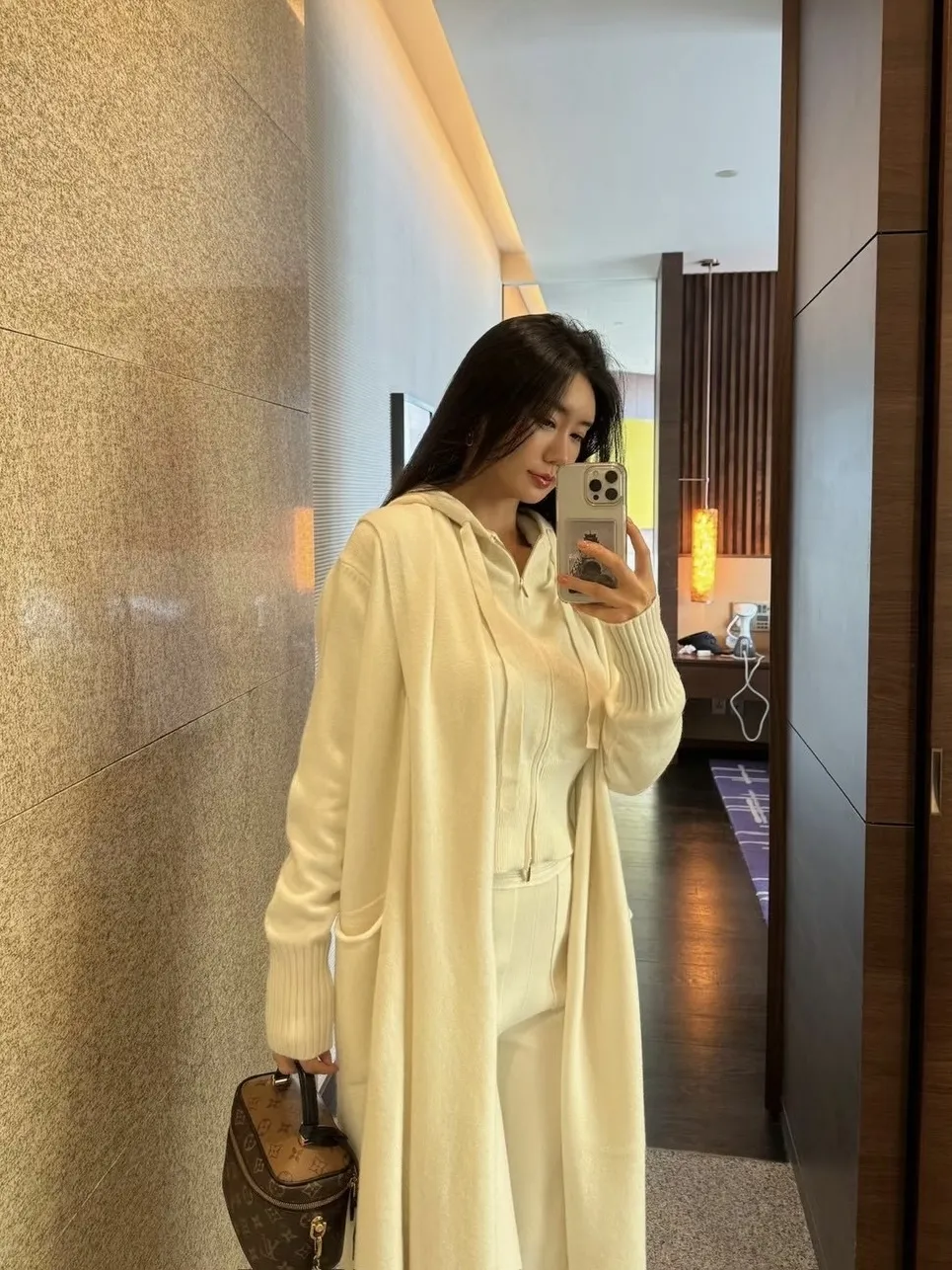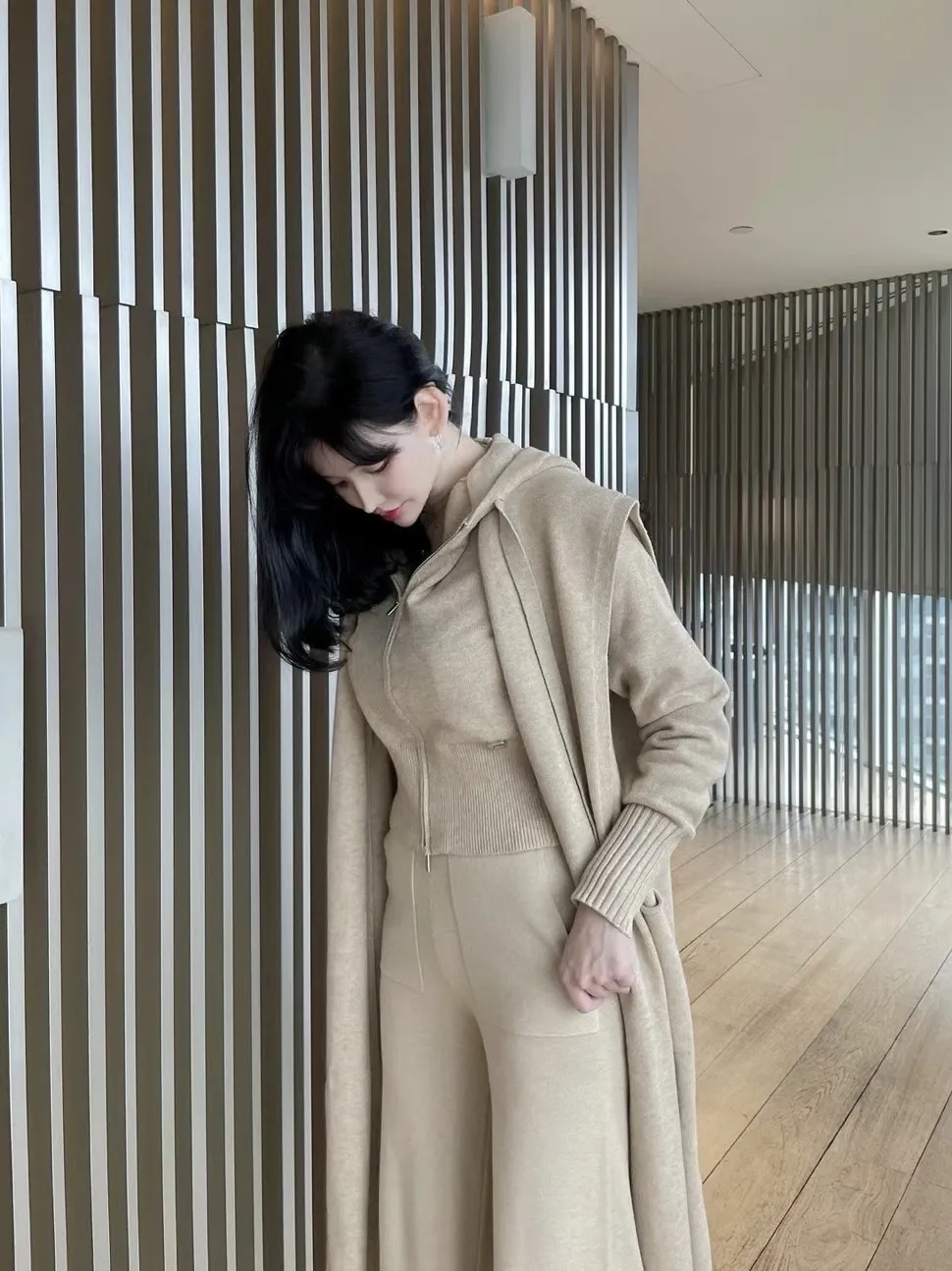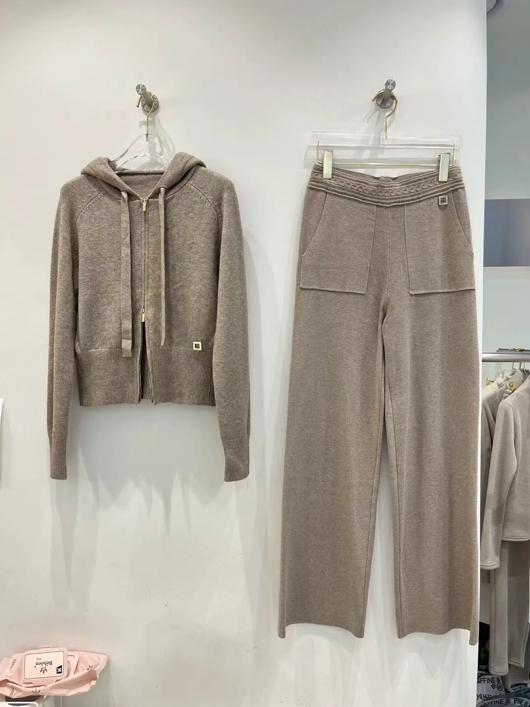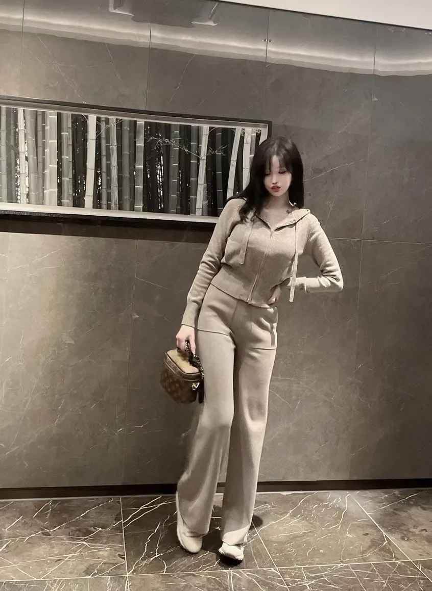 氣質明星款 羊絨連帽外套 休閒舒適套裝 休閒長褲 set