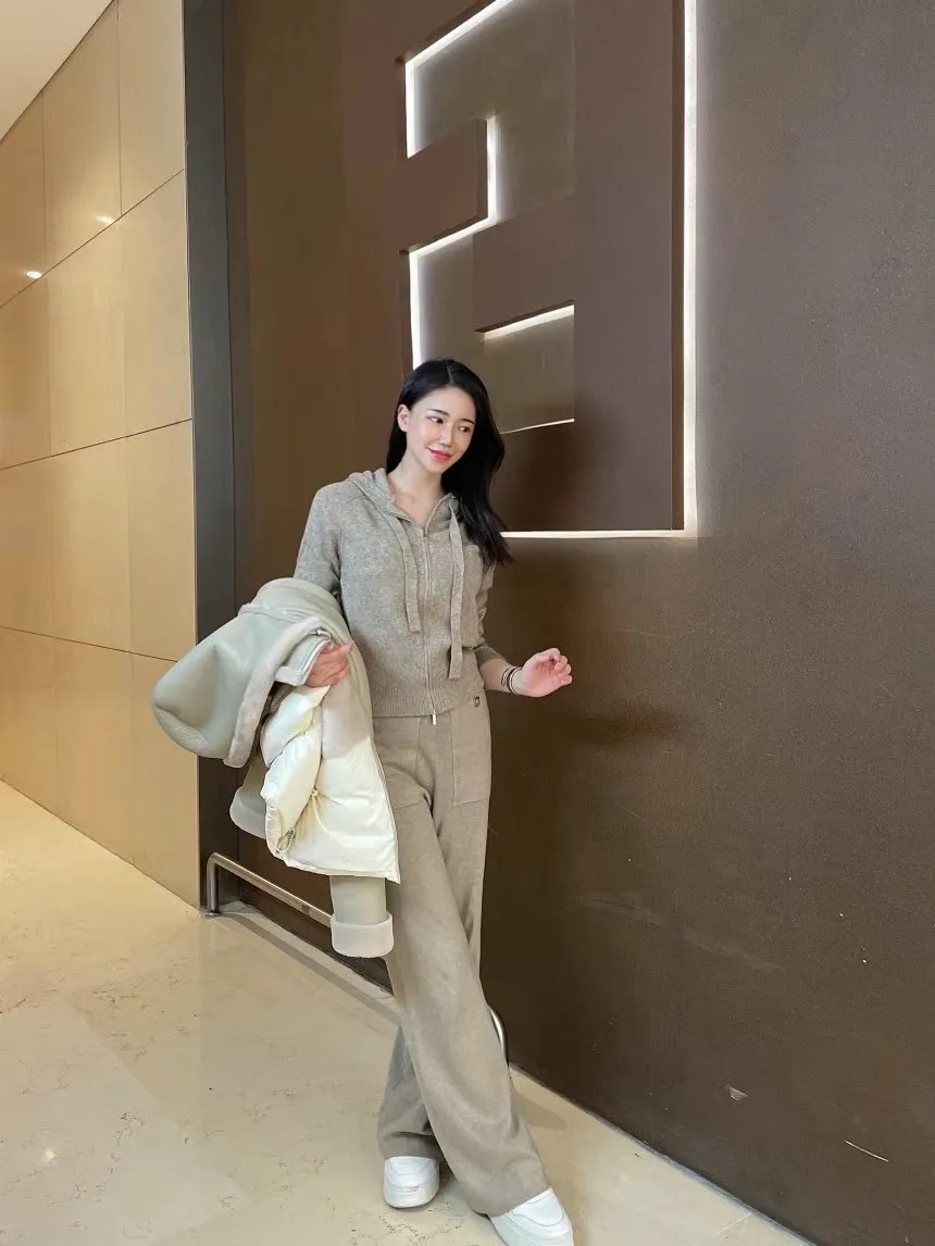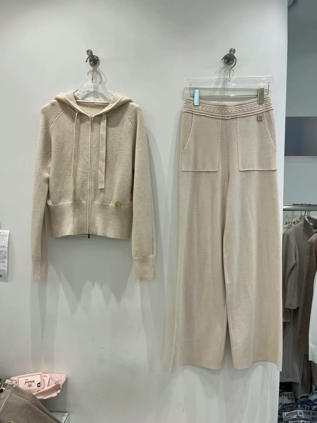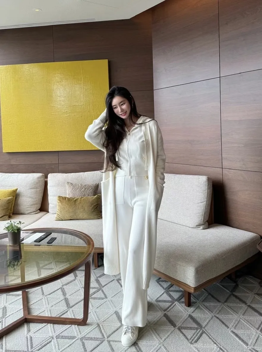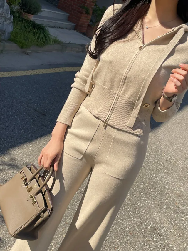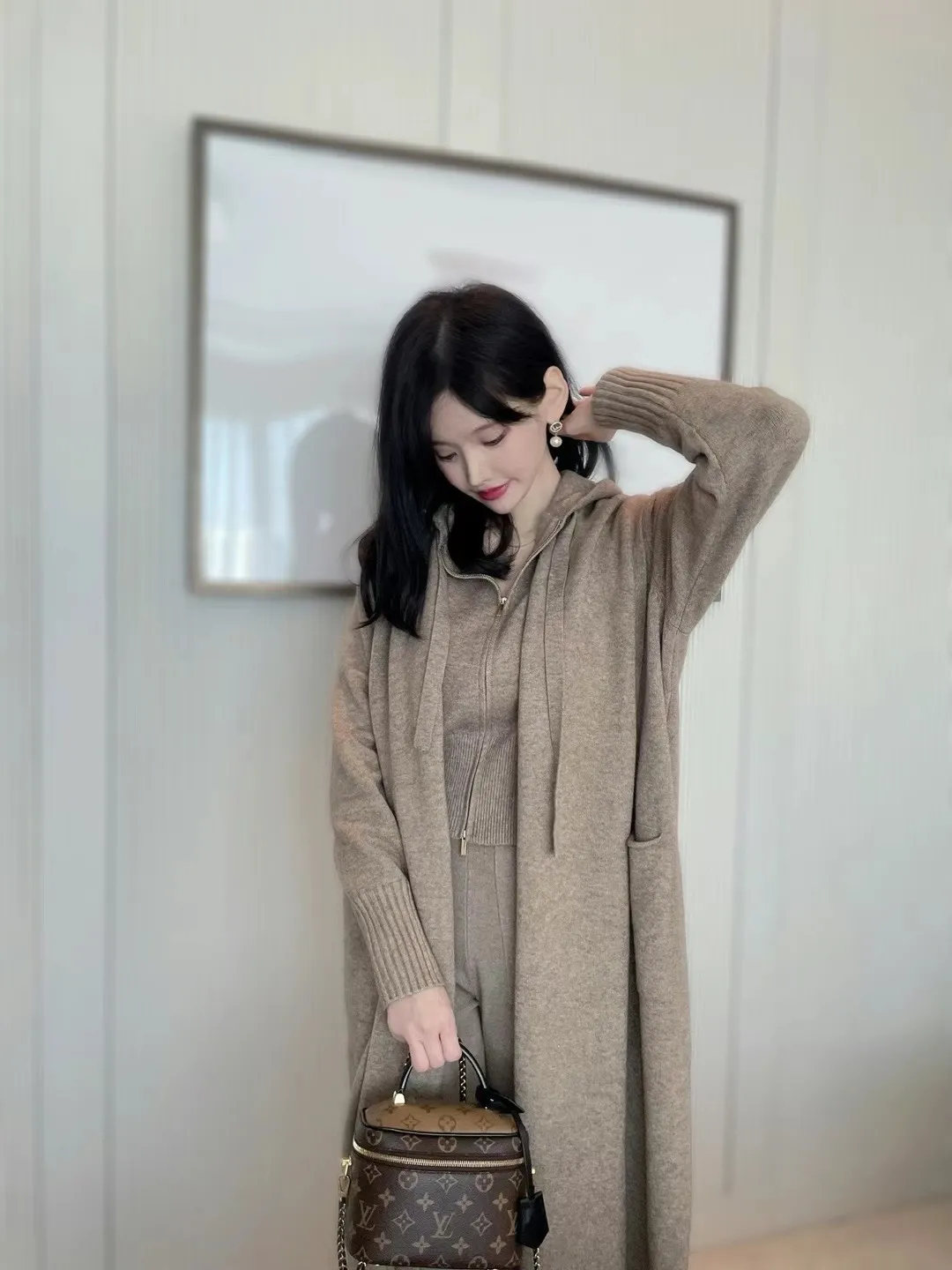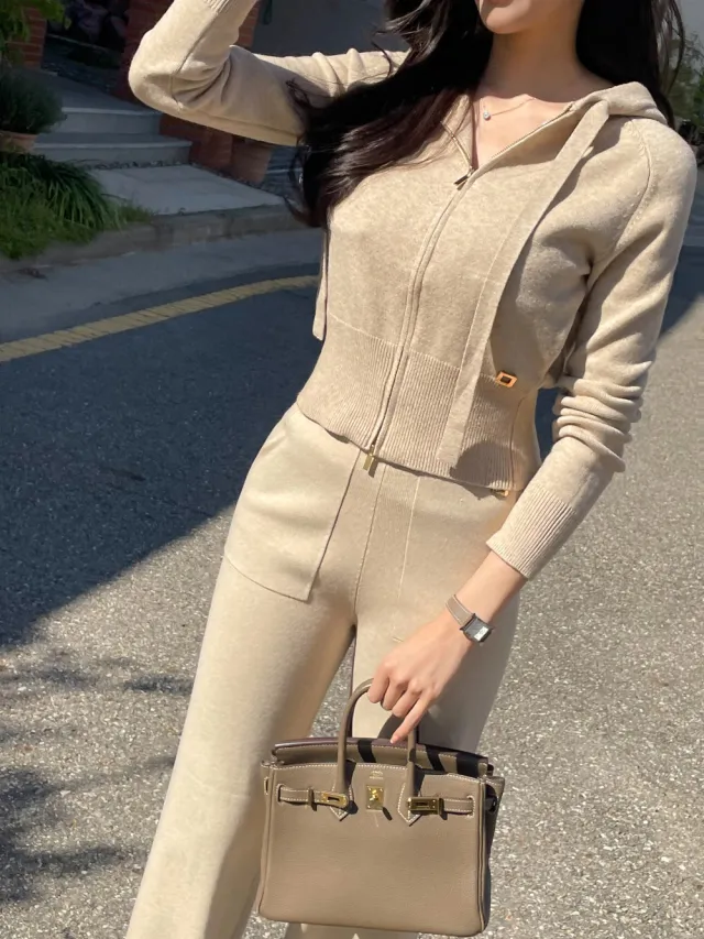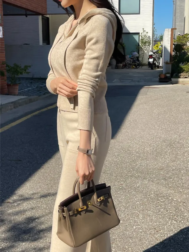 氣質明星款 羊絨連帽外套 休閒舒適套裝 休閒長褲 set
