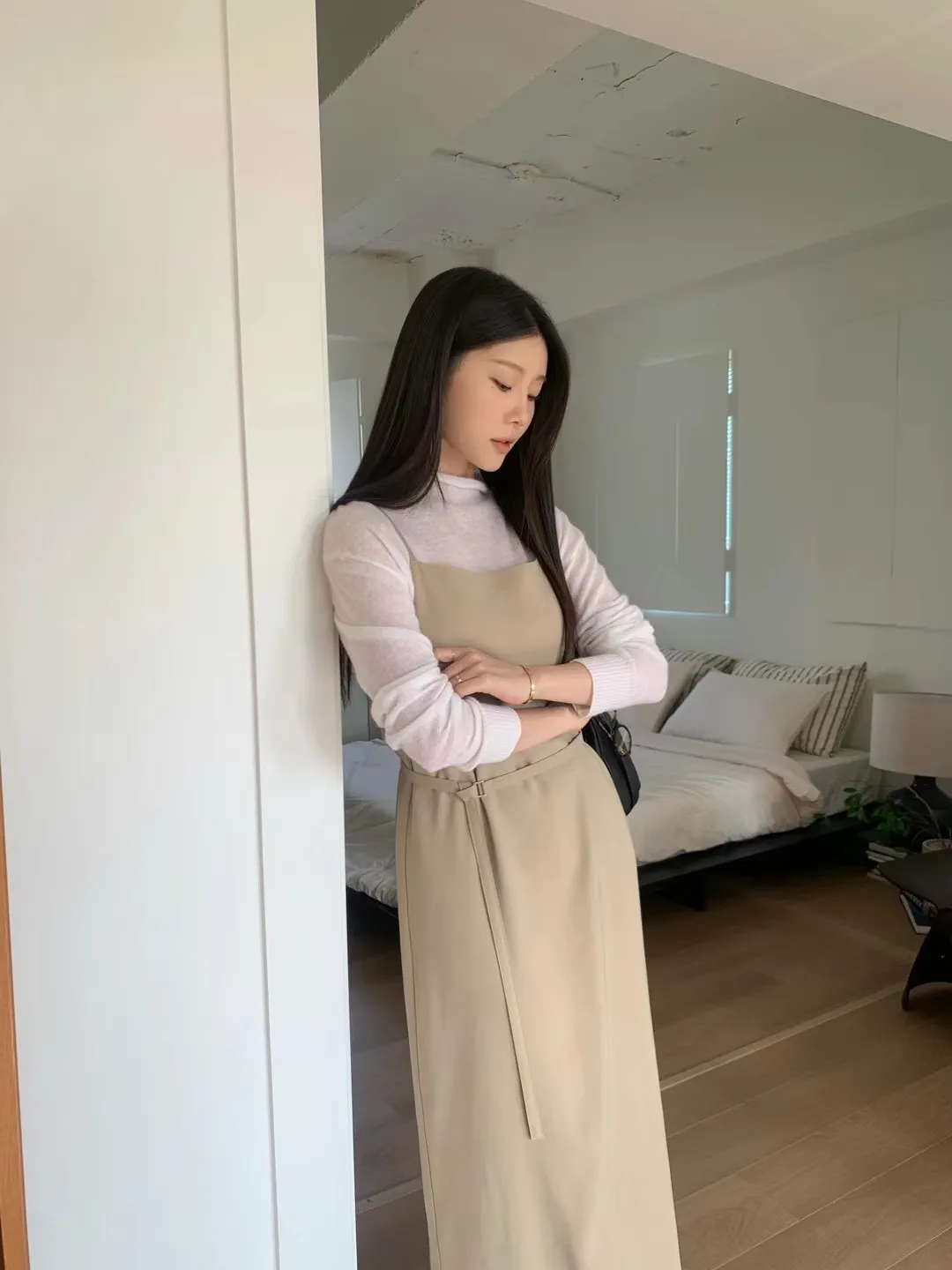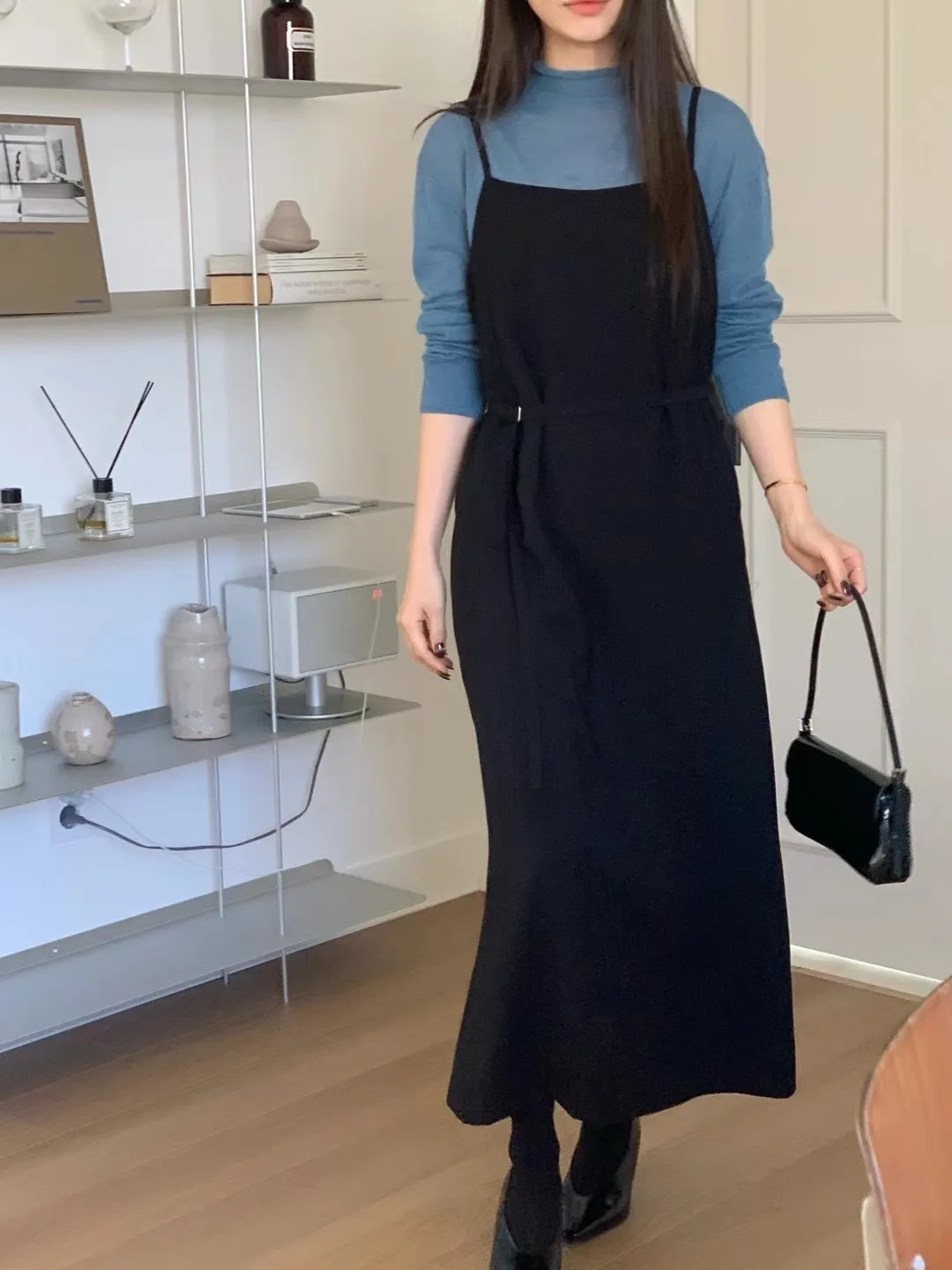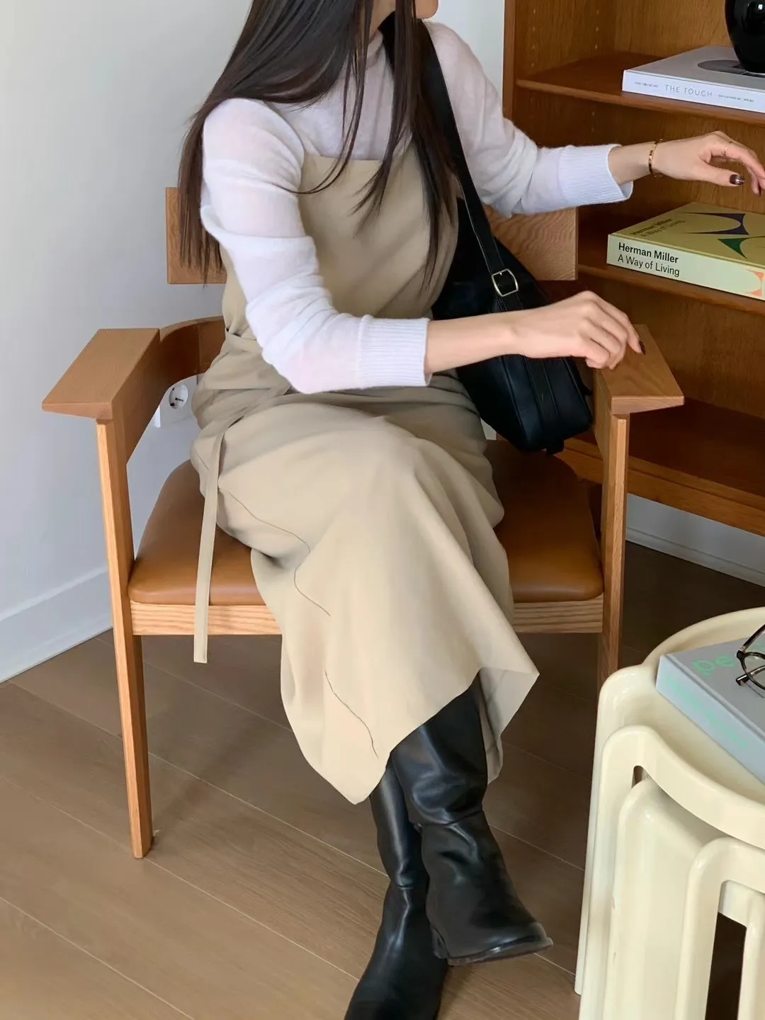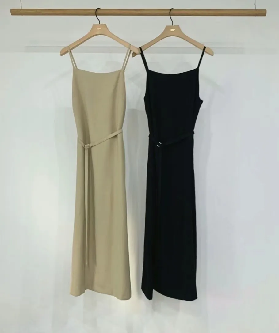 優雅細肩帶修身綁帶長版連身裙
