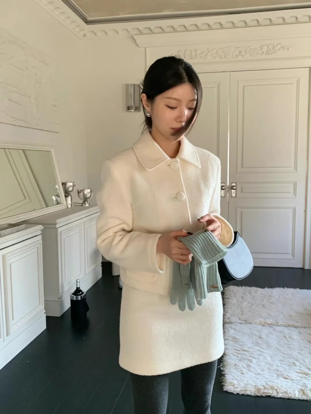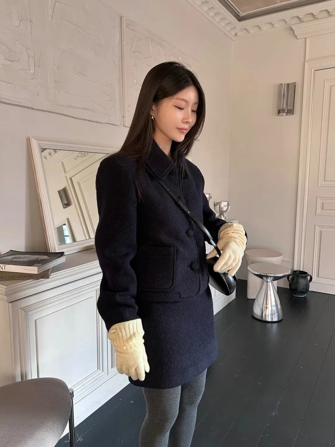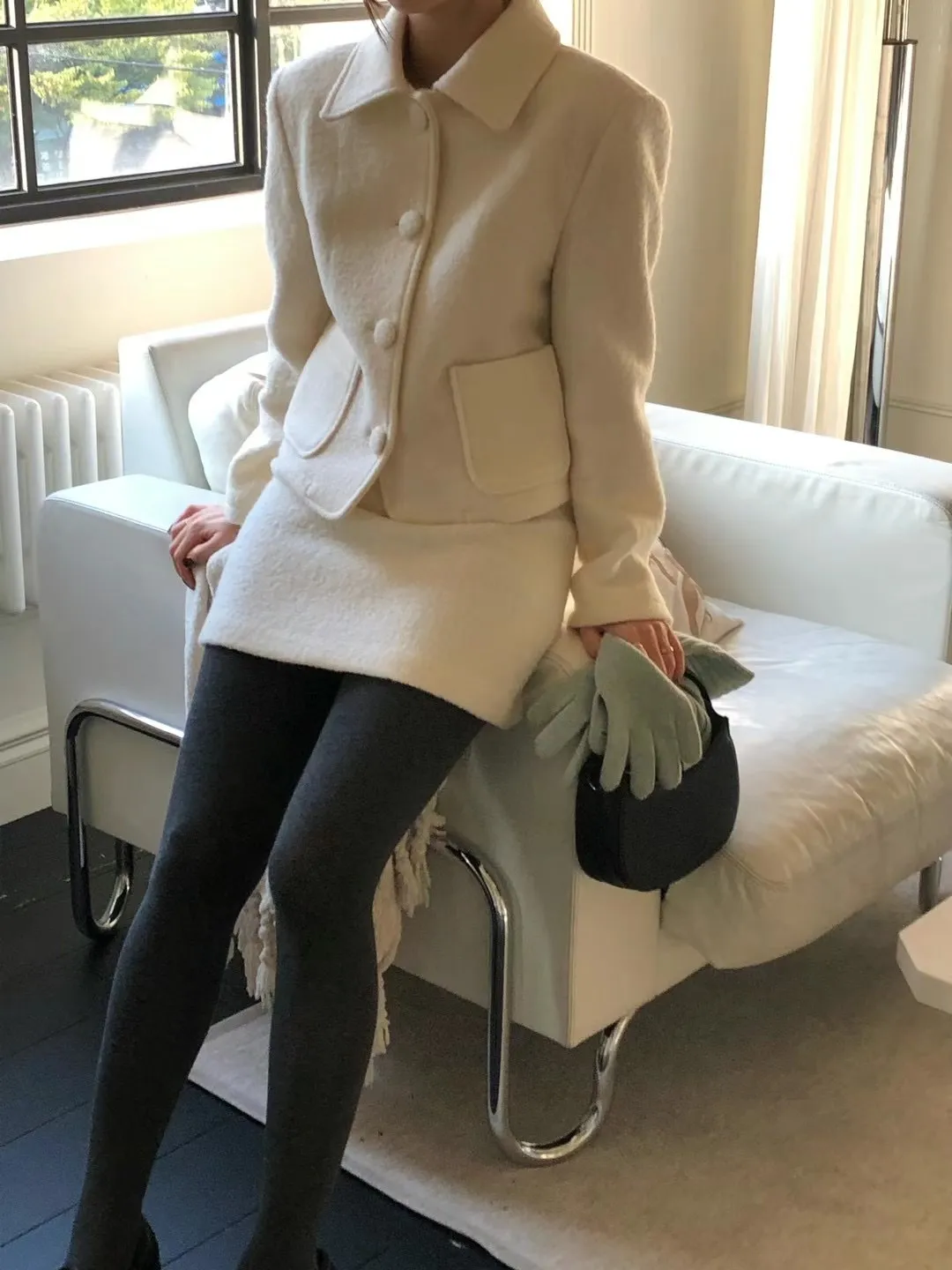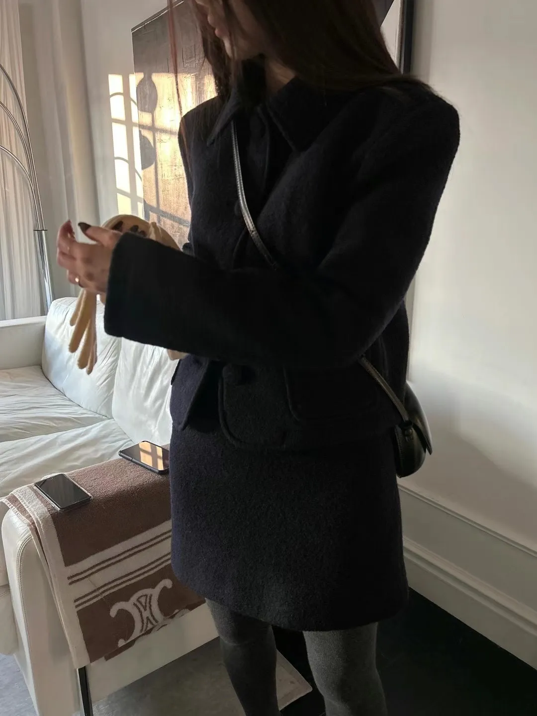氣質溫暖修身羊毛外套+高腰短裙 套裝set