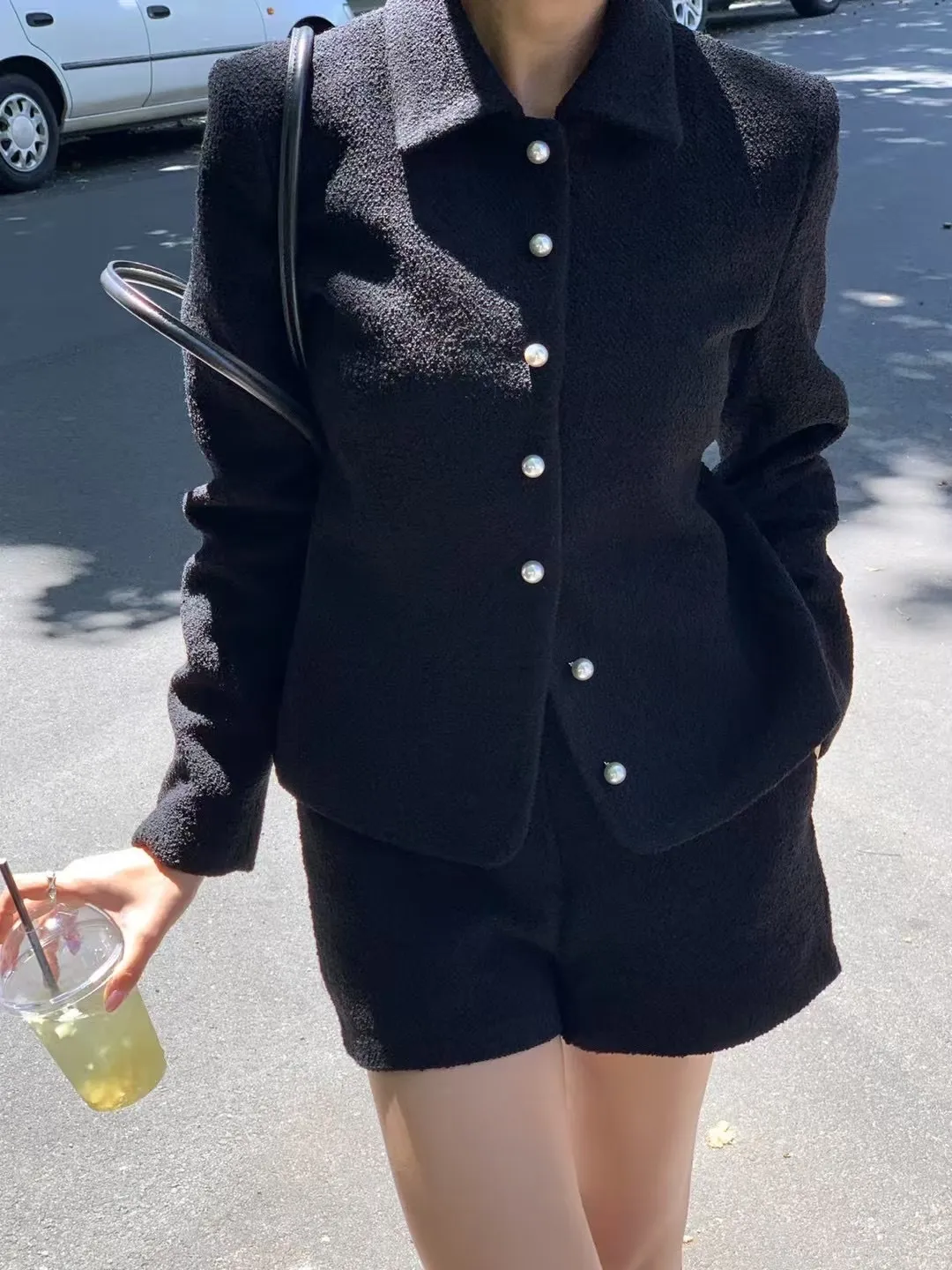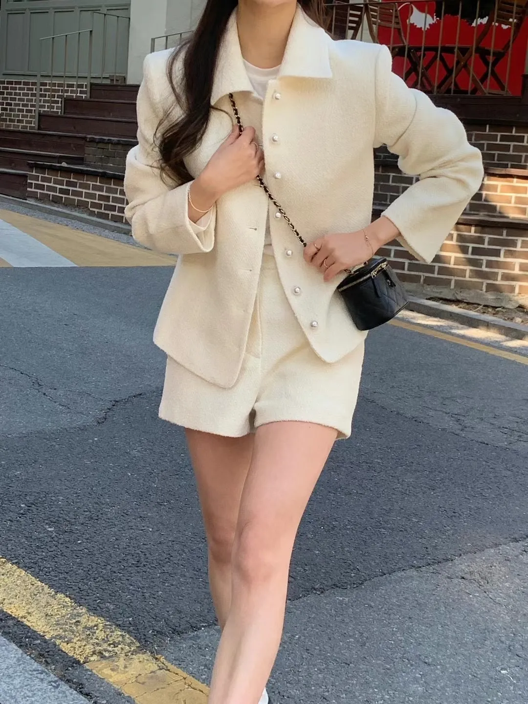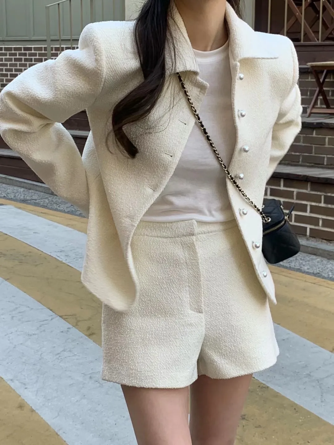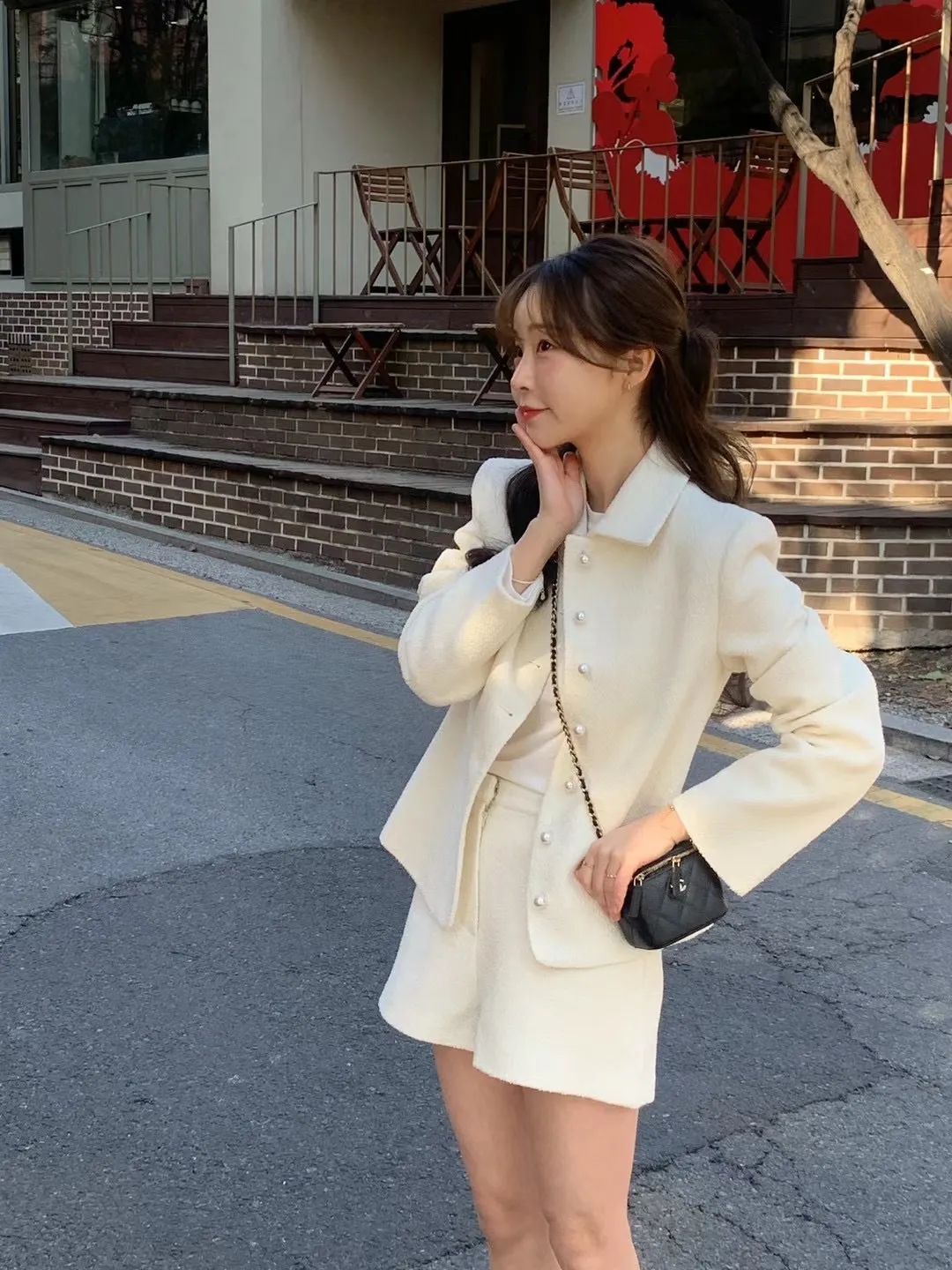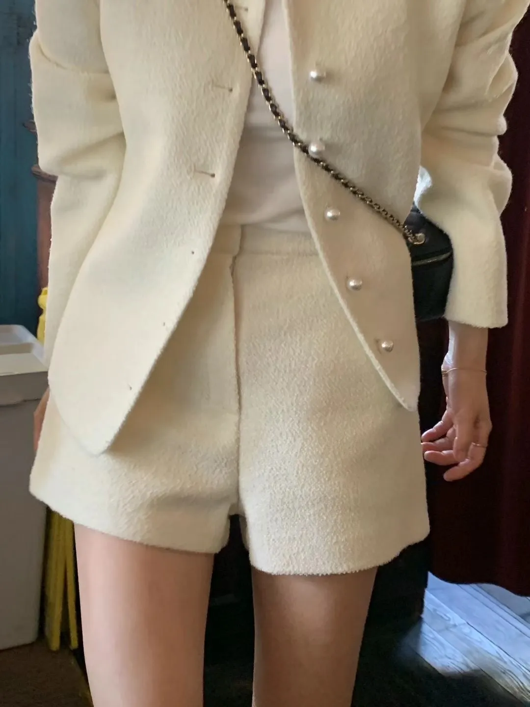 巴黎晨曦珍珠羊毛呢外套+顯瘦短褲套裝