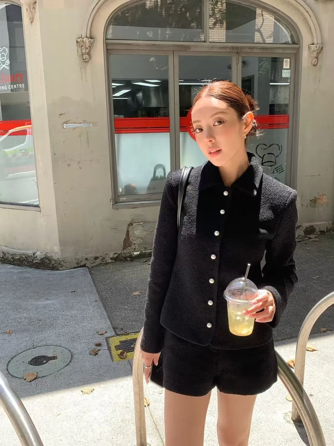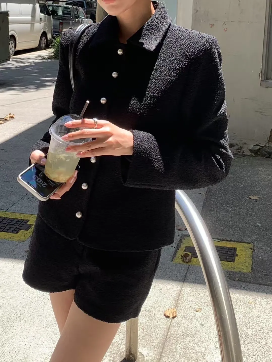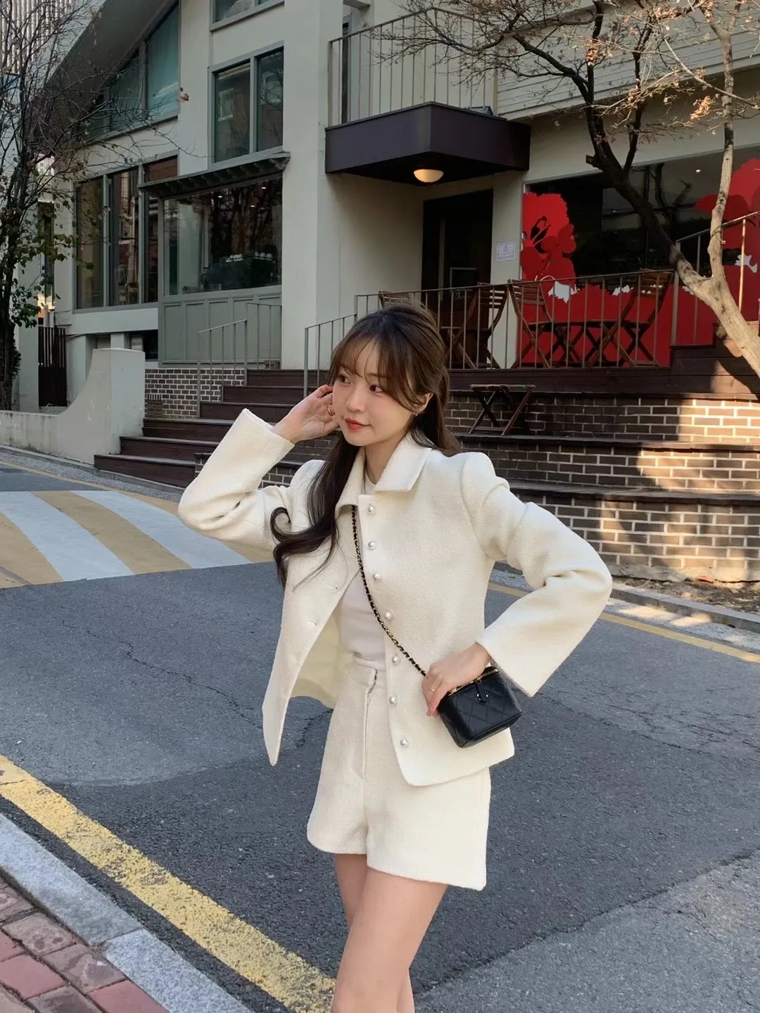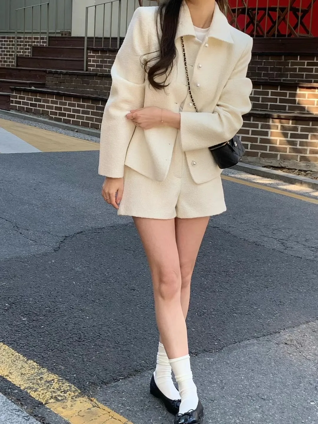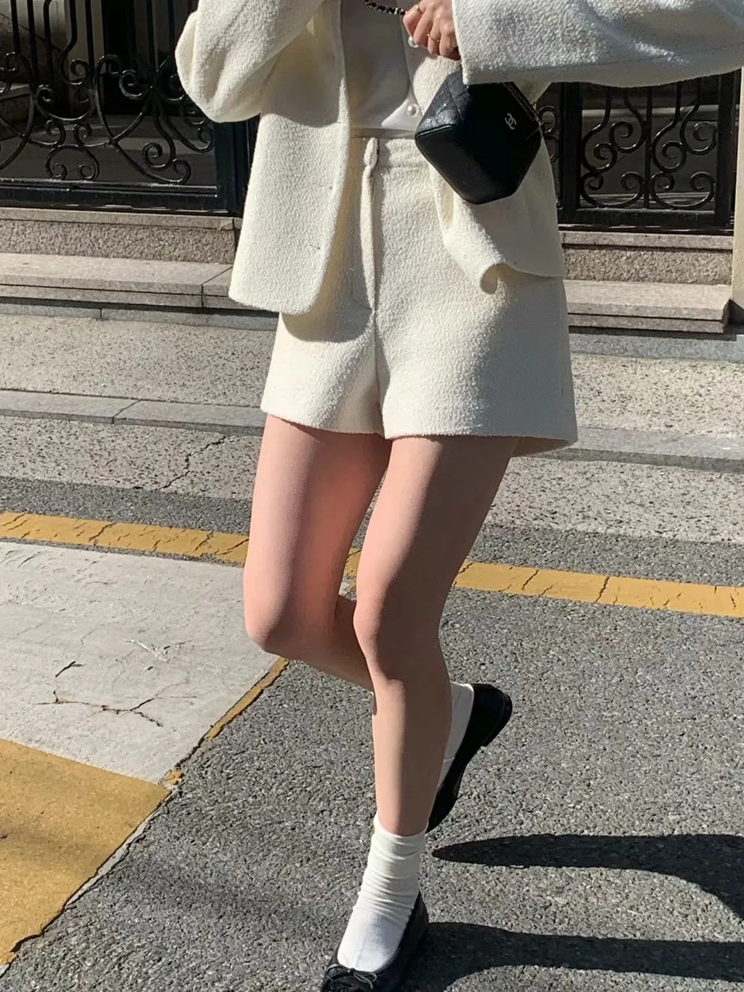 巴黎晨曦珍珠羊毛呢外套+顯瘦短褲套裝