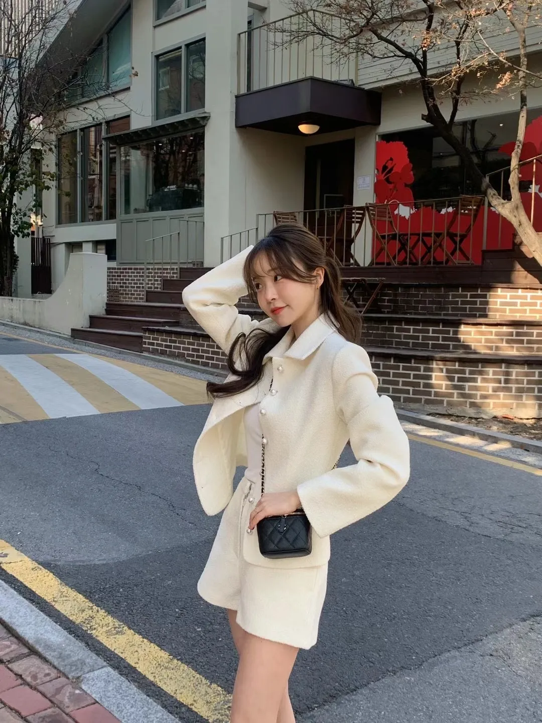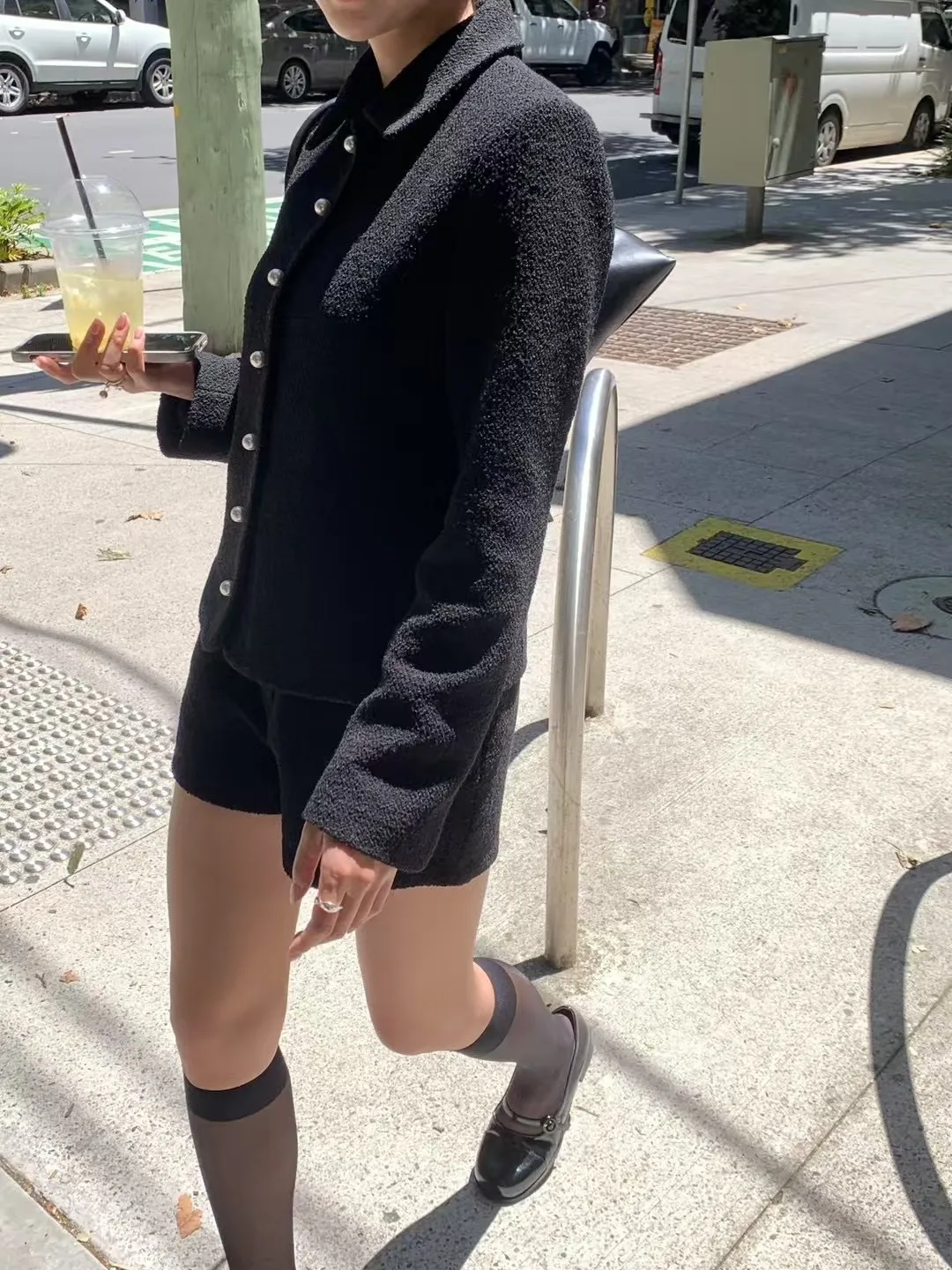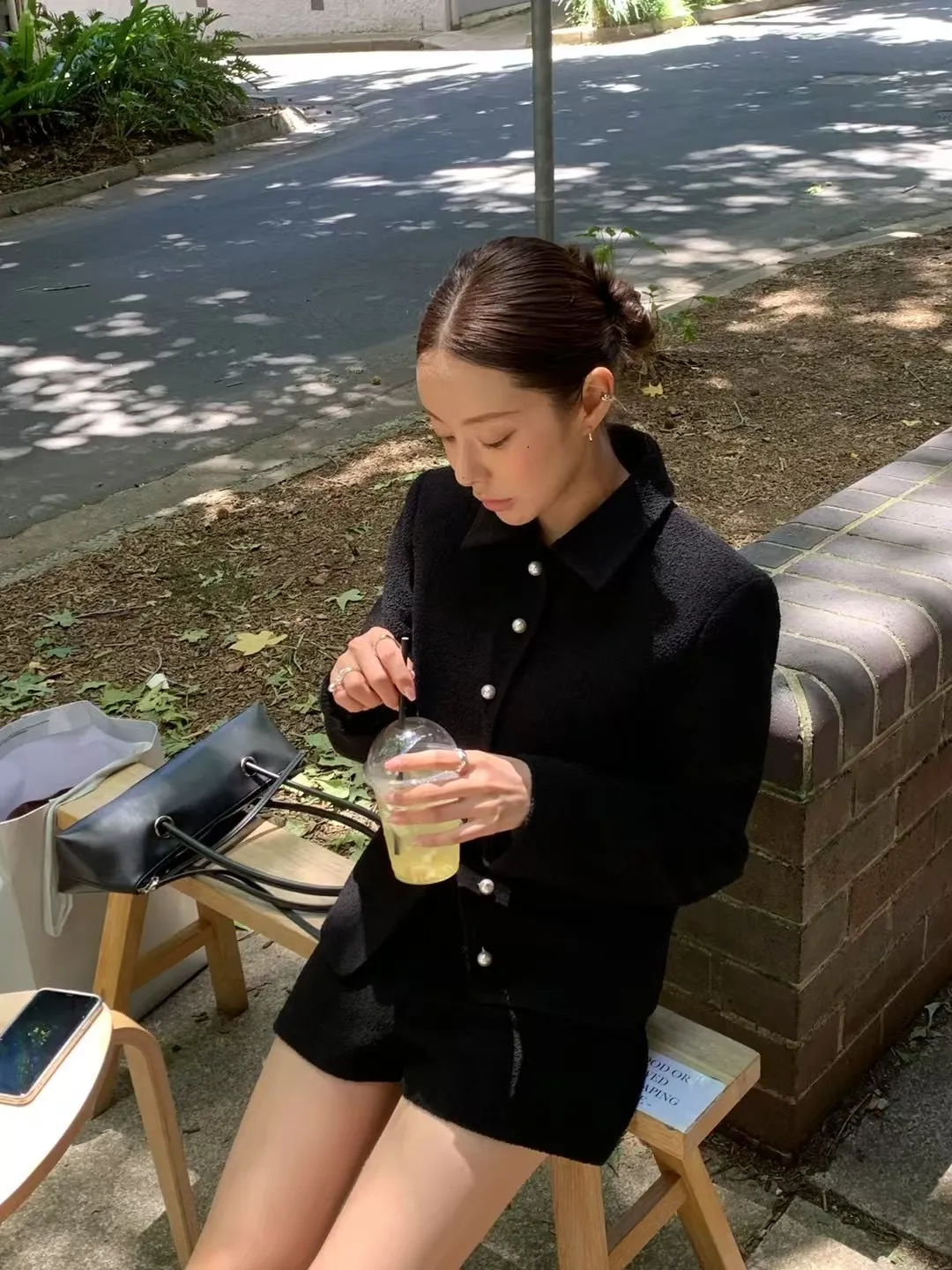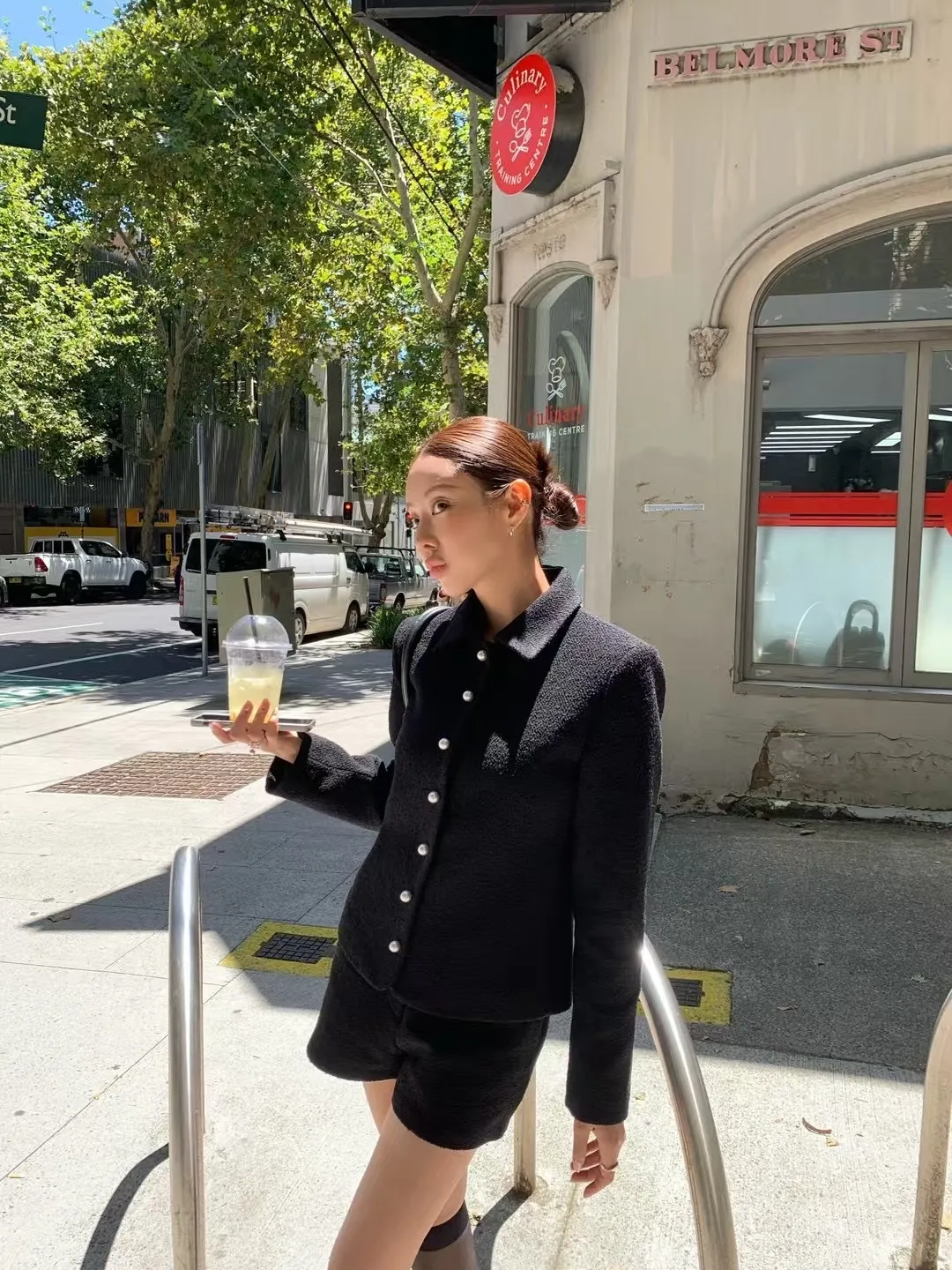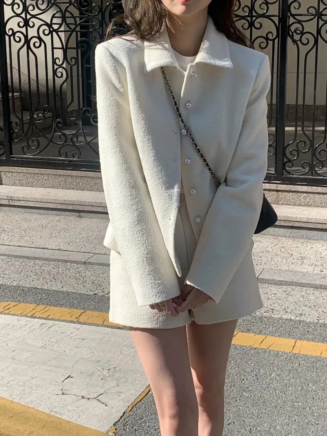 巴黎晨曦珍珠羊毛呢外套+顯瘦短褲套裝