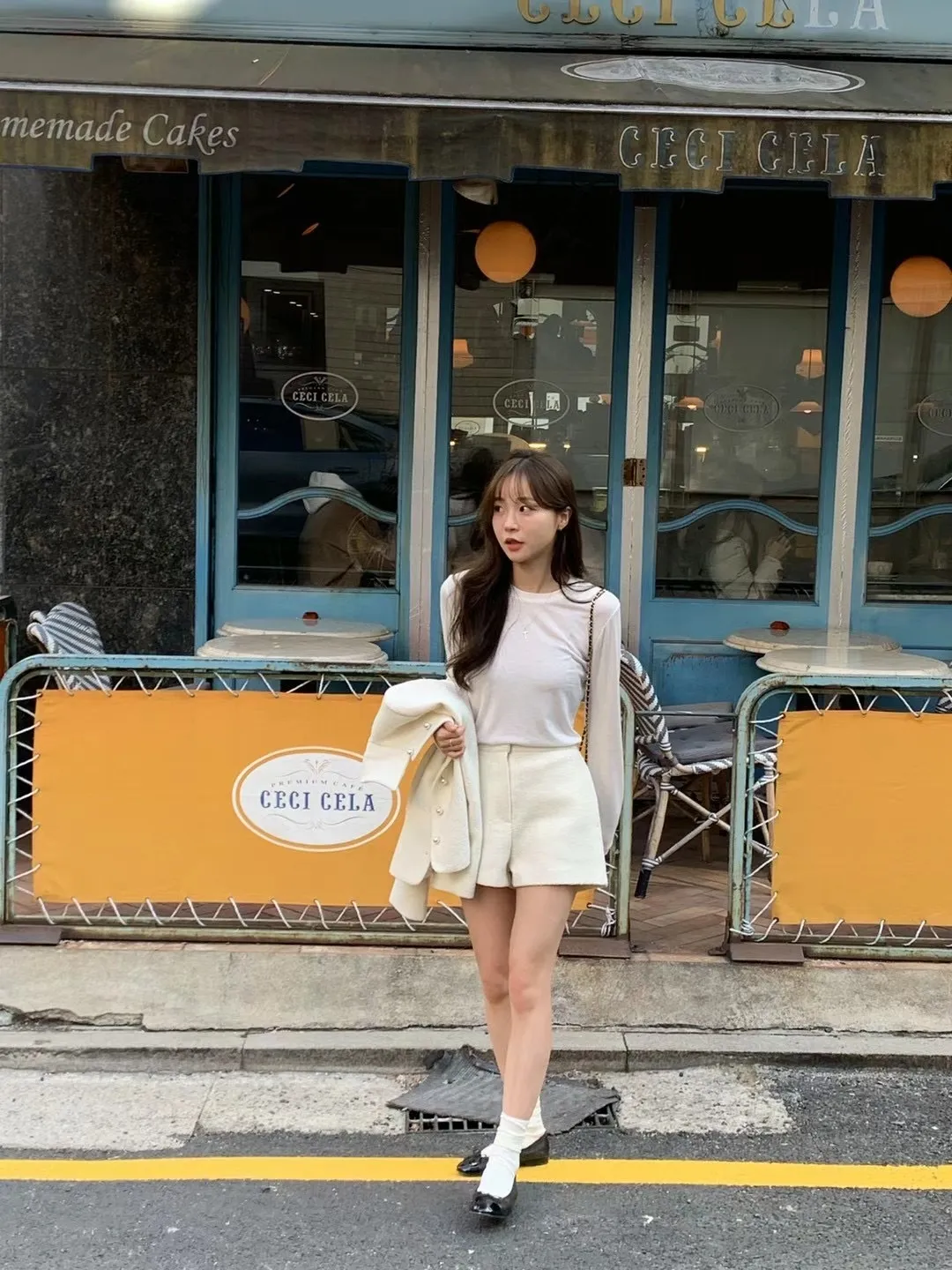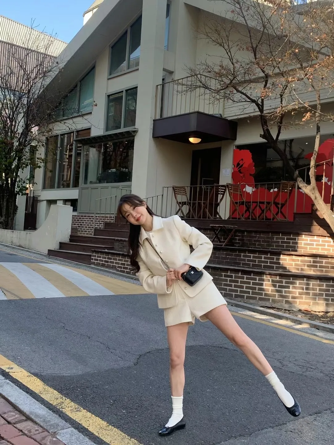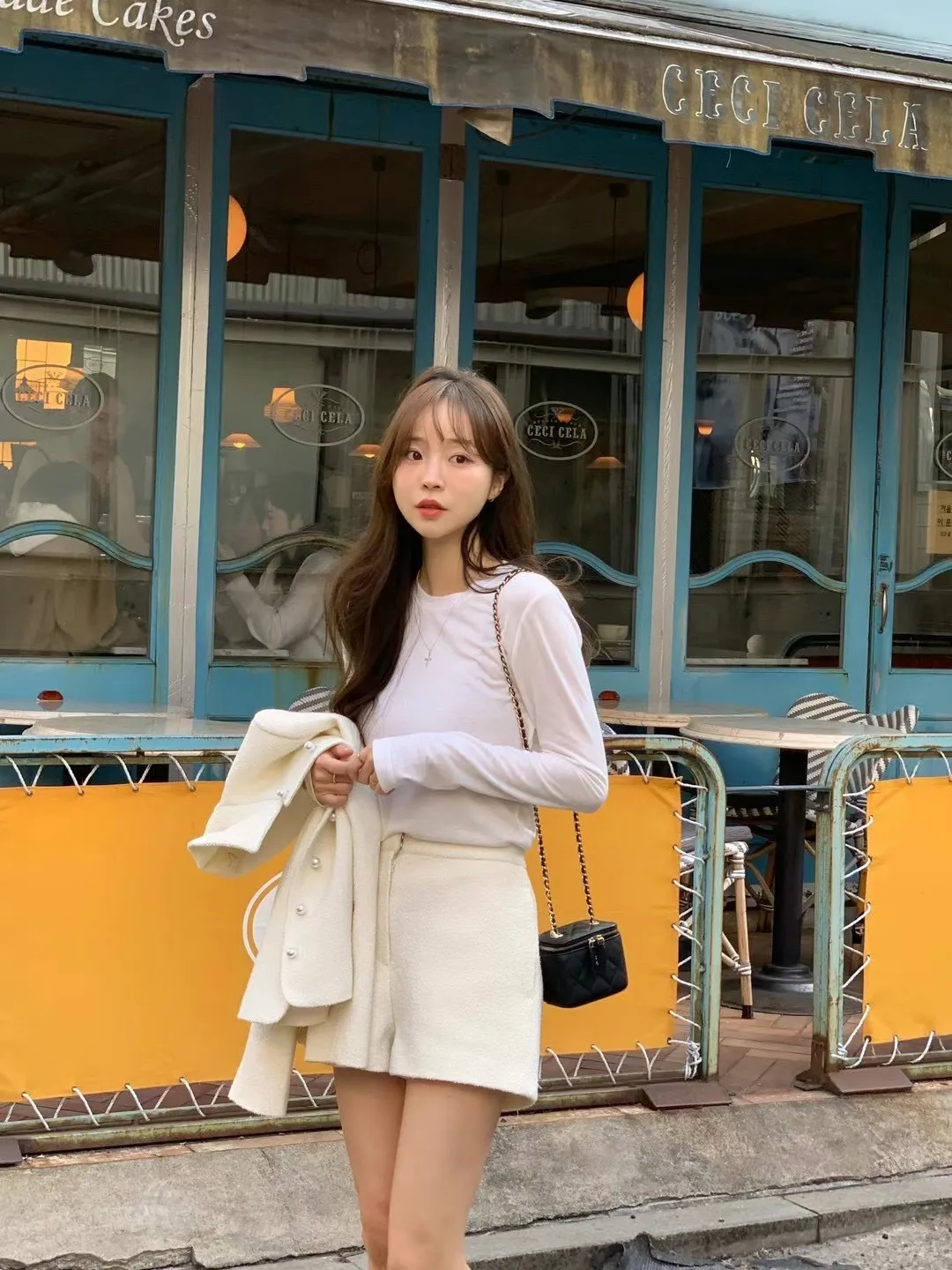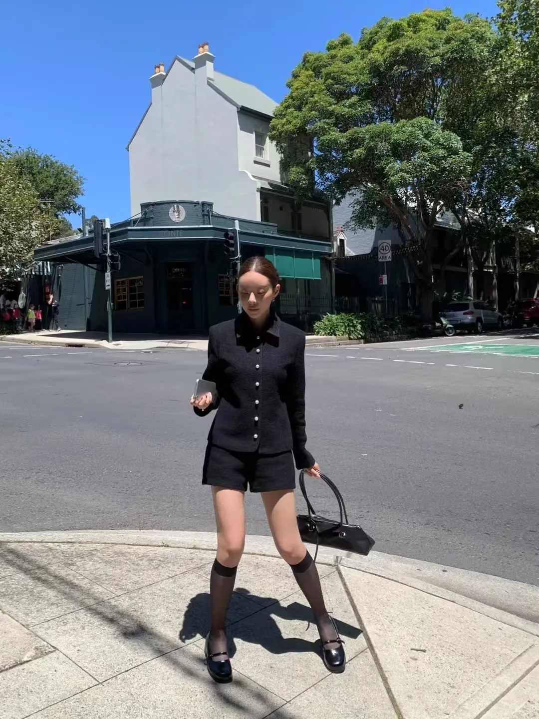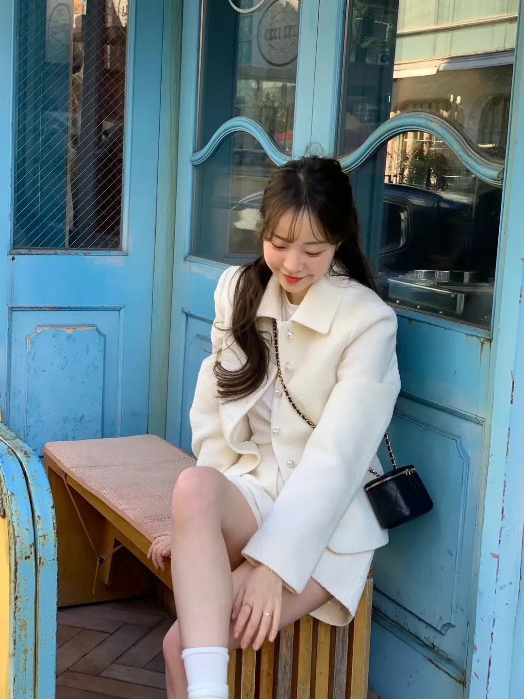 巴黎晨曦珍珠羊毛呢外套+顯瘦短褲套裝