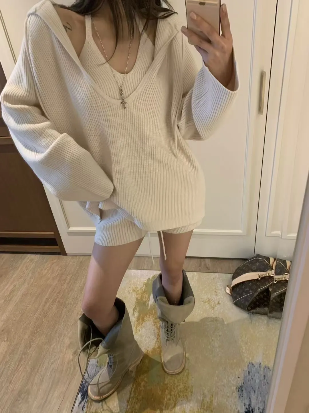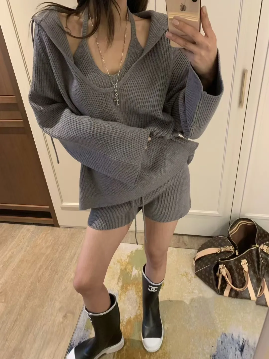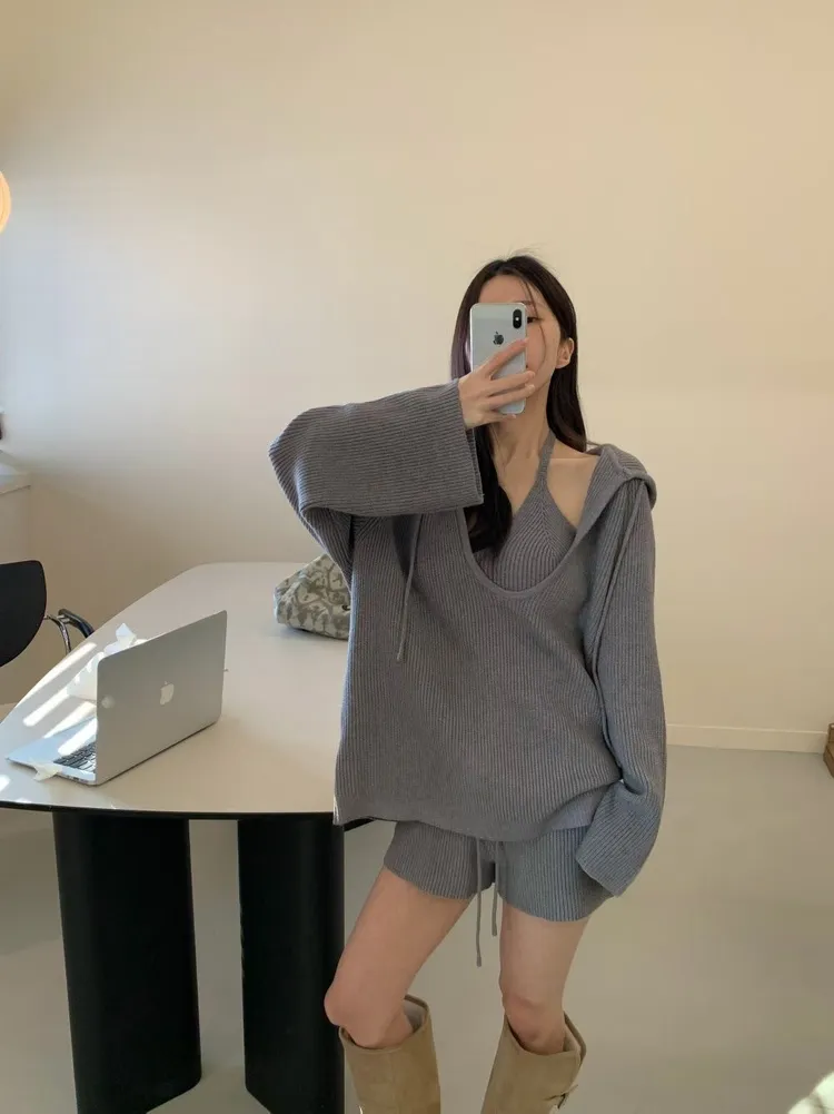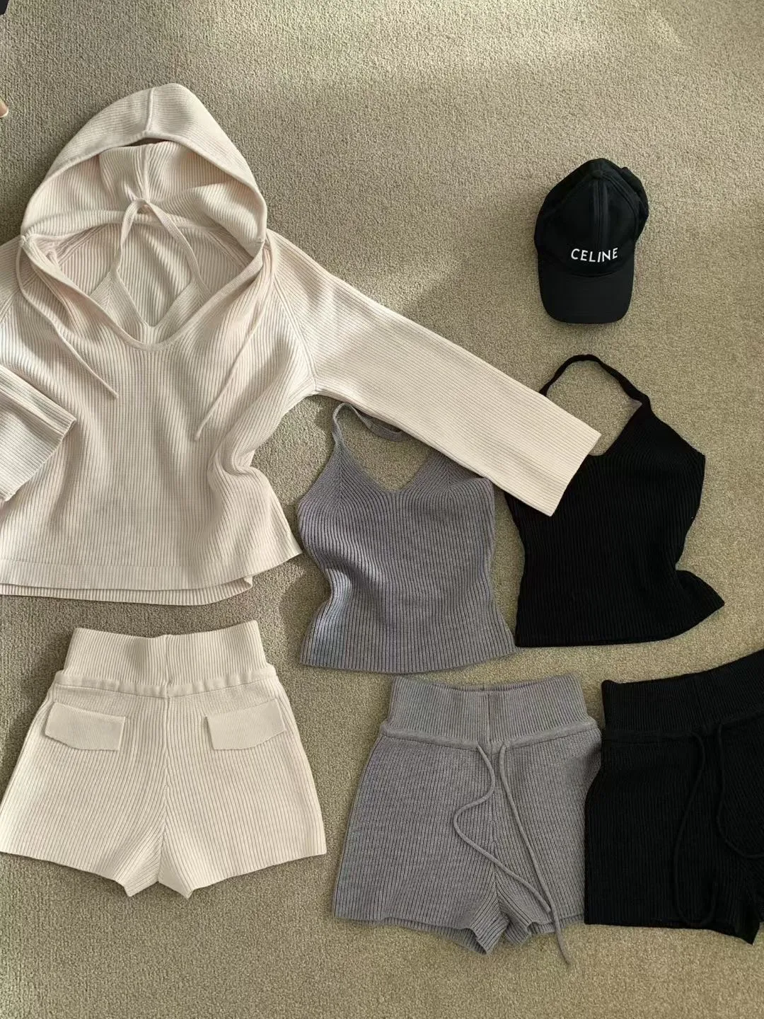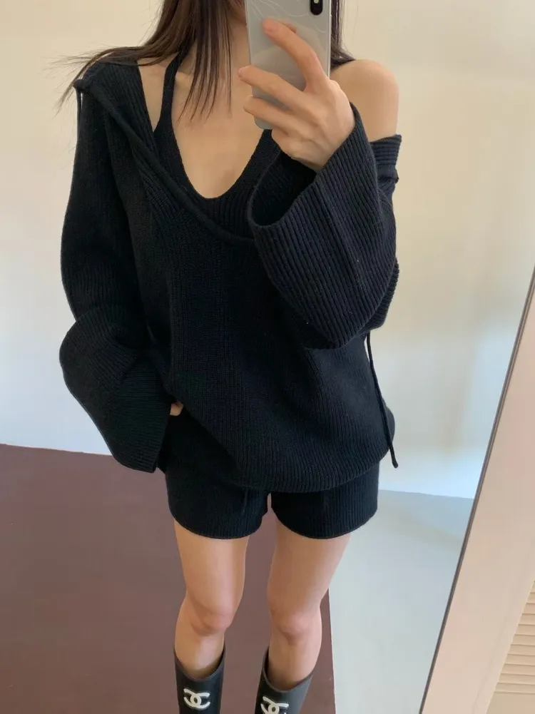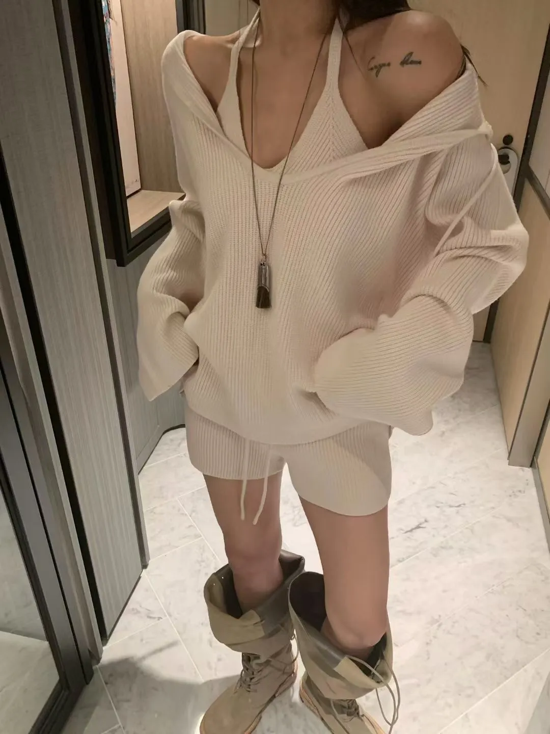 繞脖背心+連帽針織上衣+抽繩短褲套裝