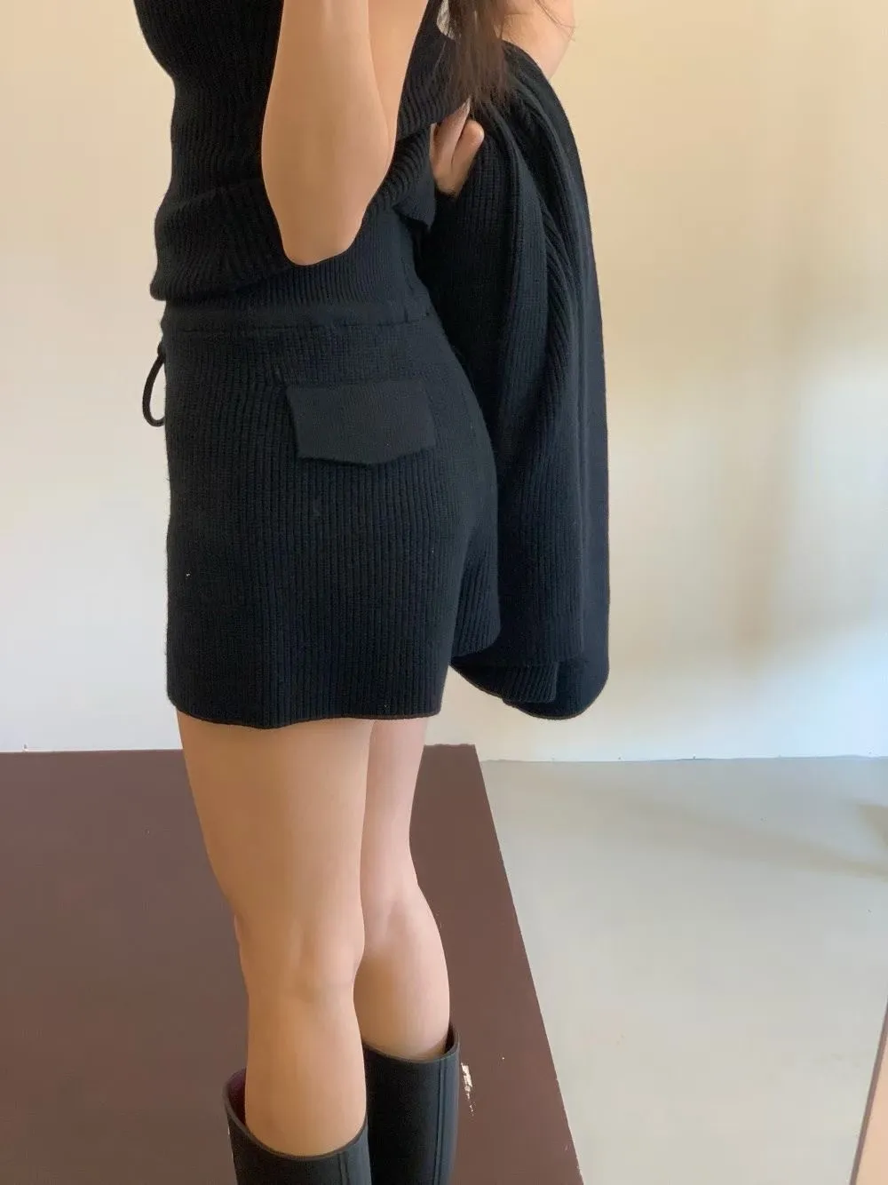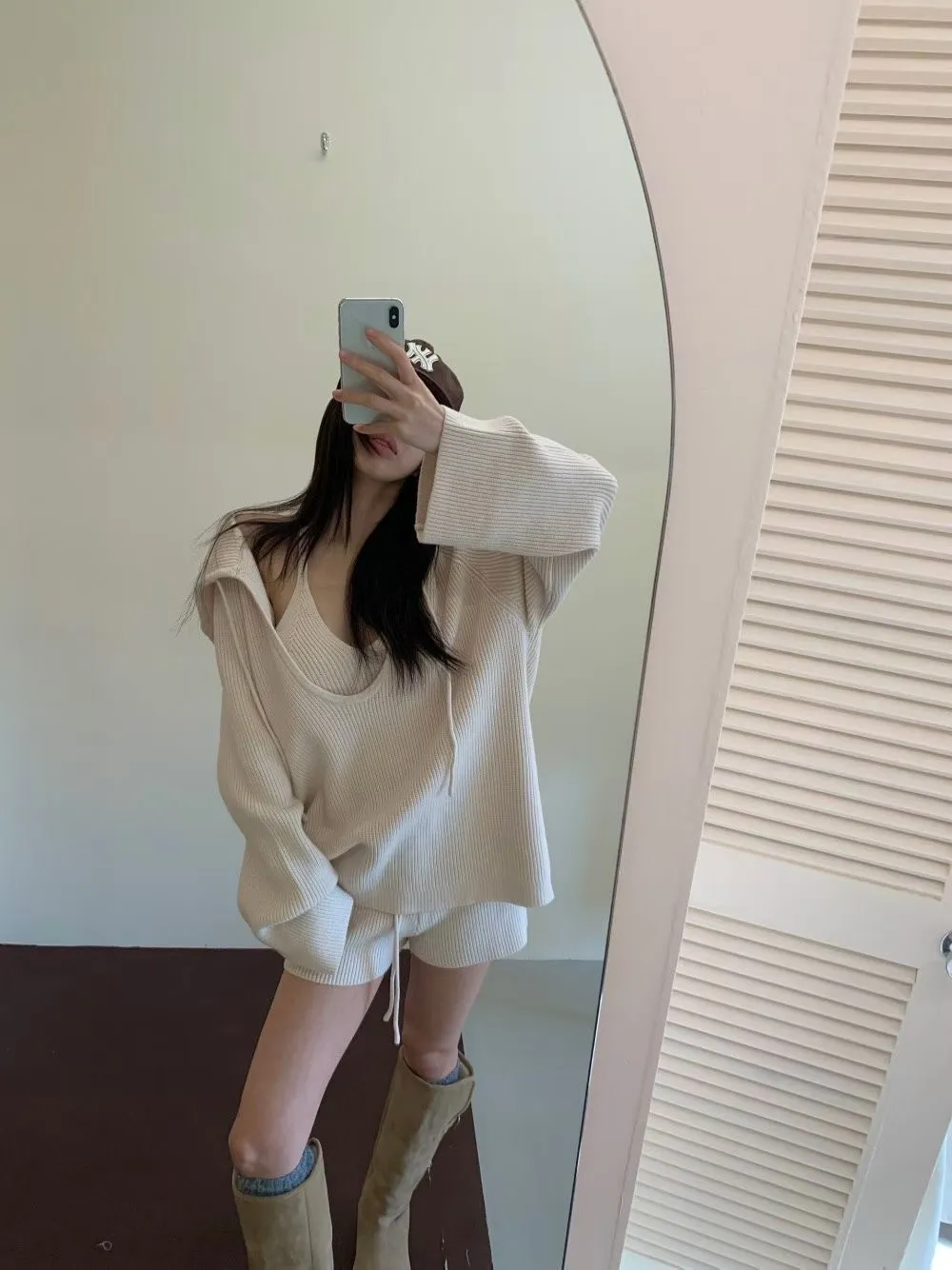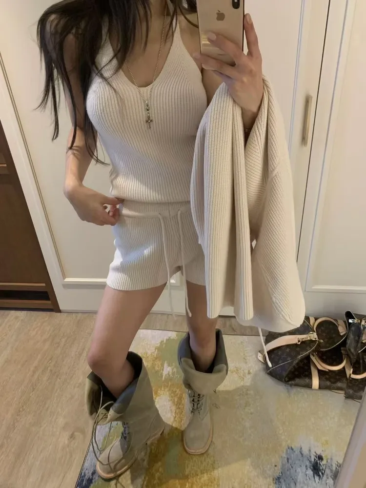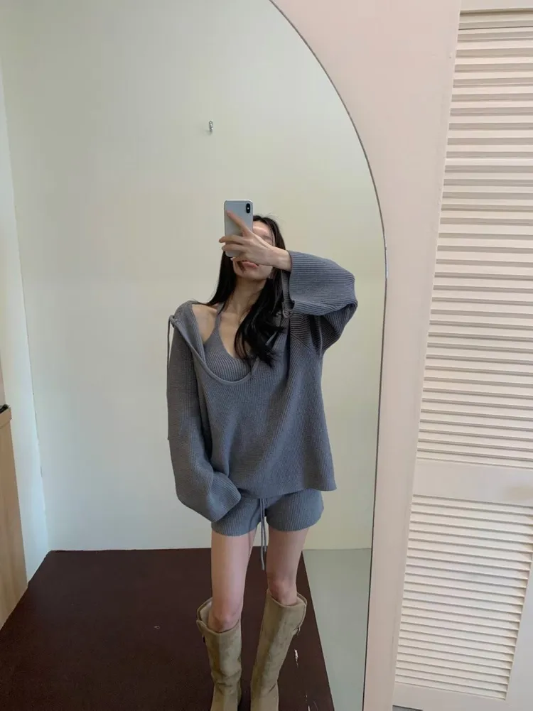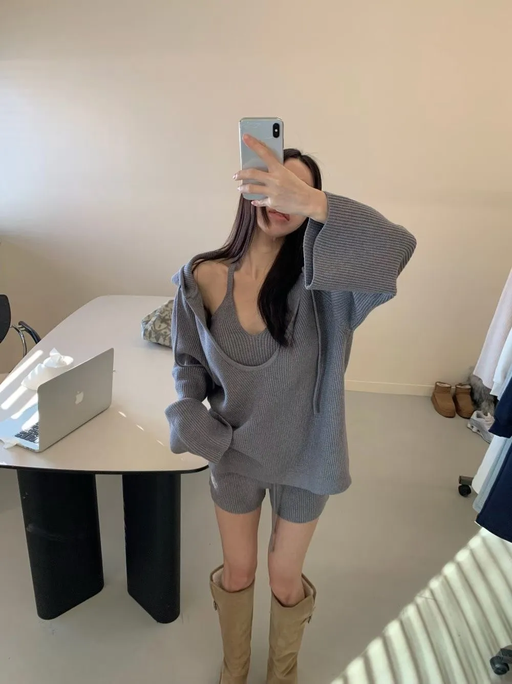 繞脖背心+連帽針織上衣+抽繩短褲套裝