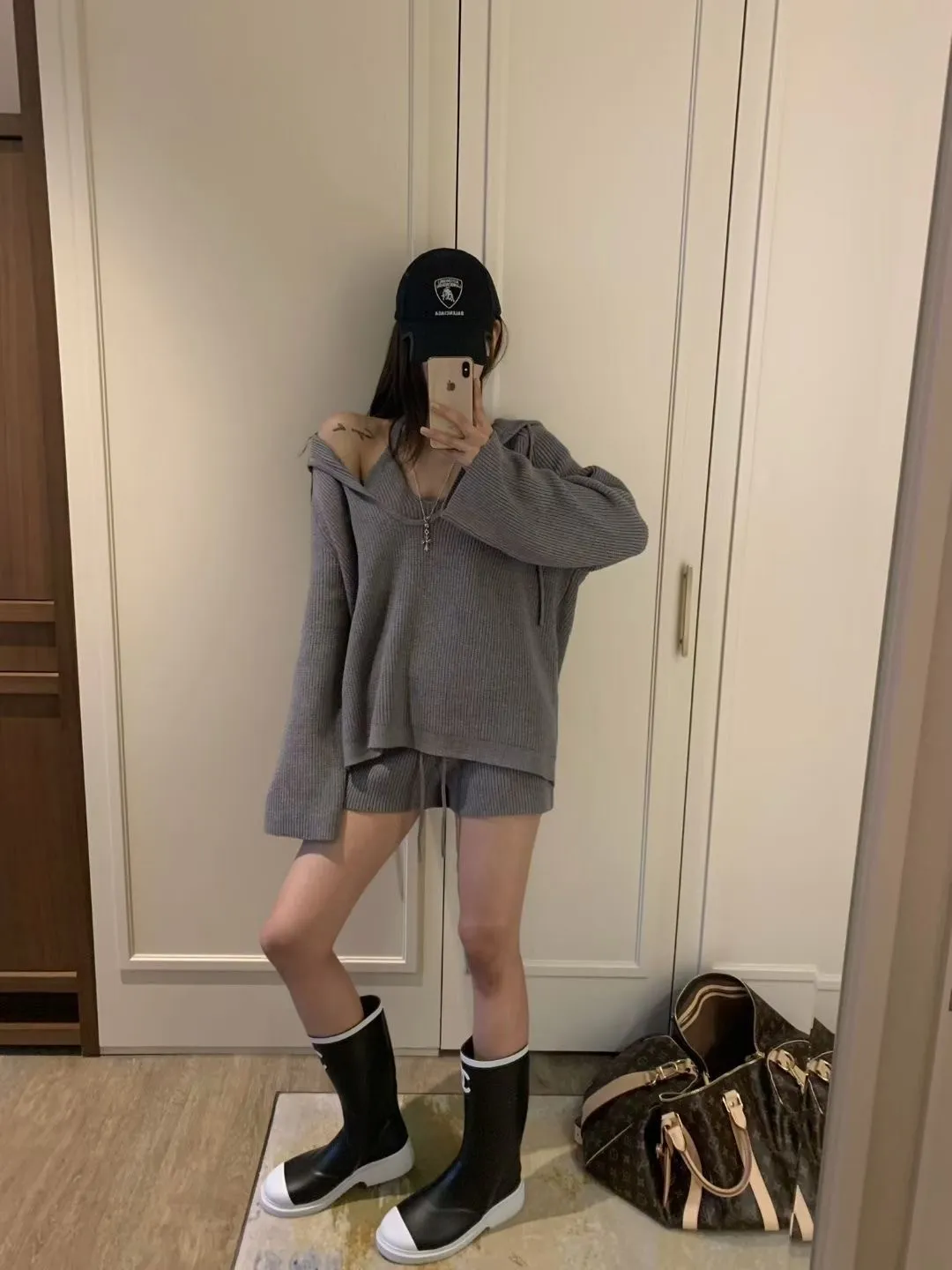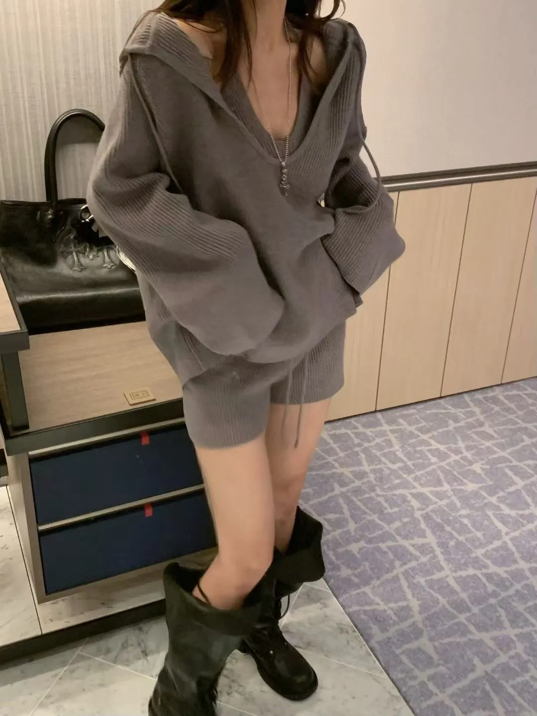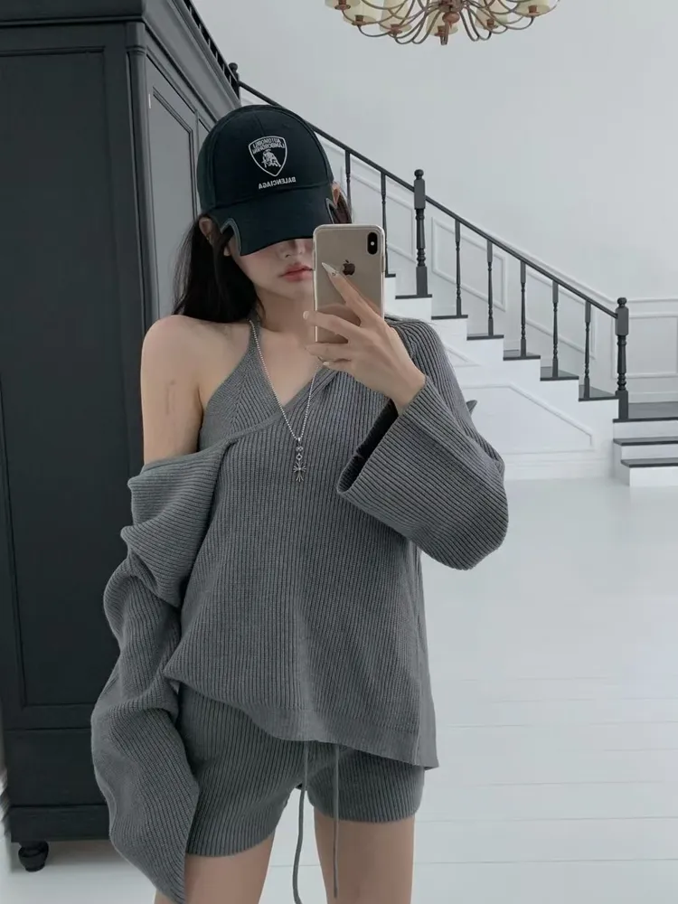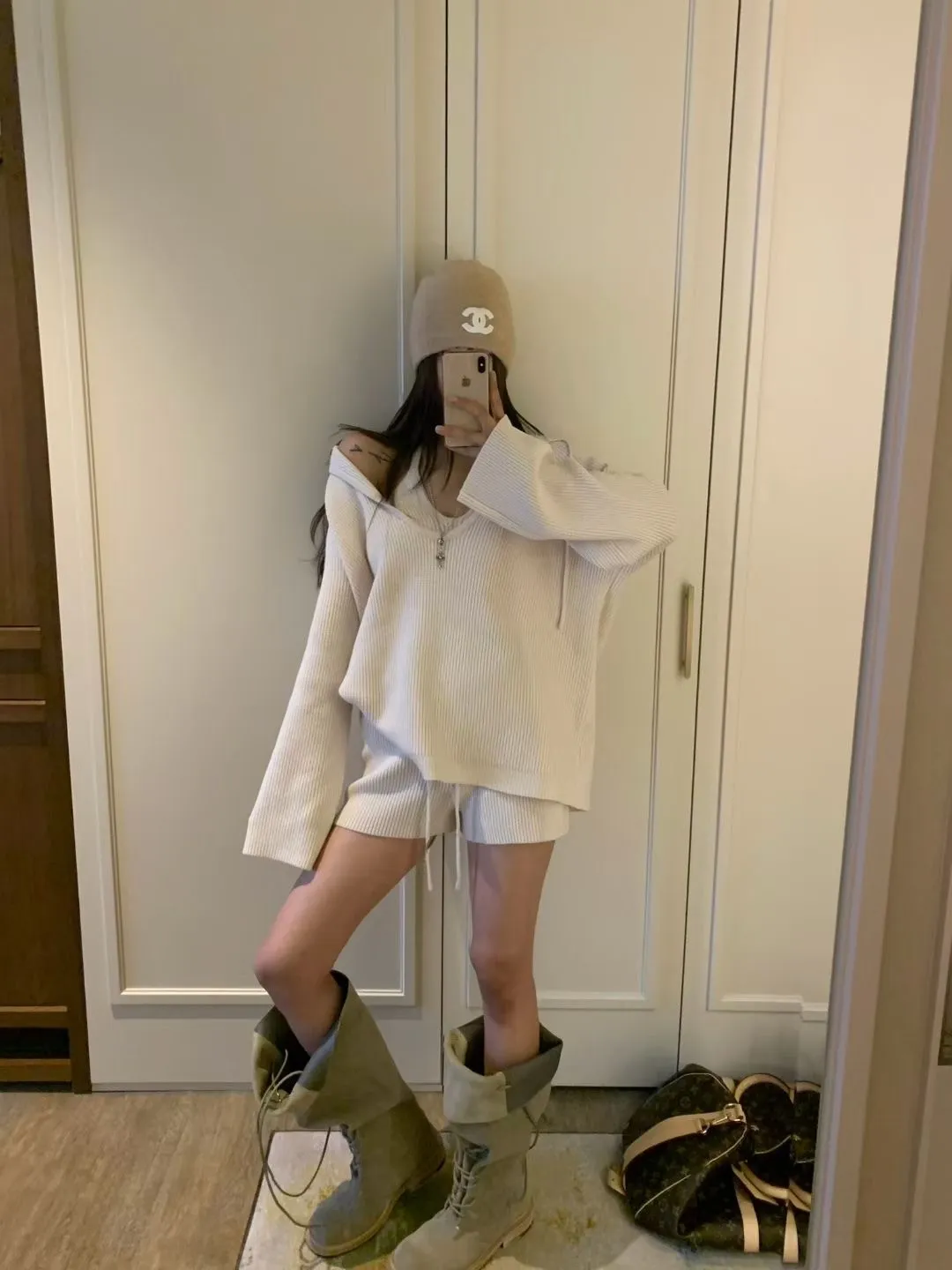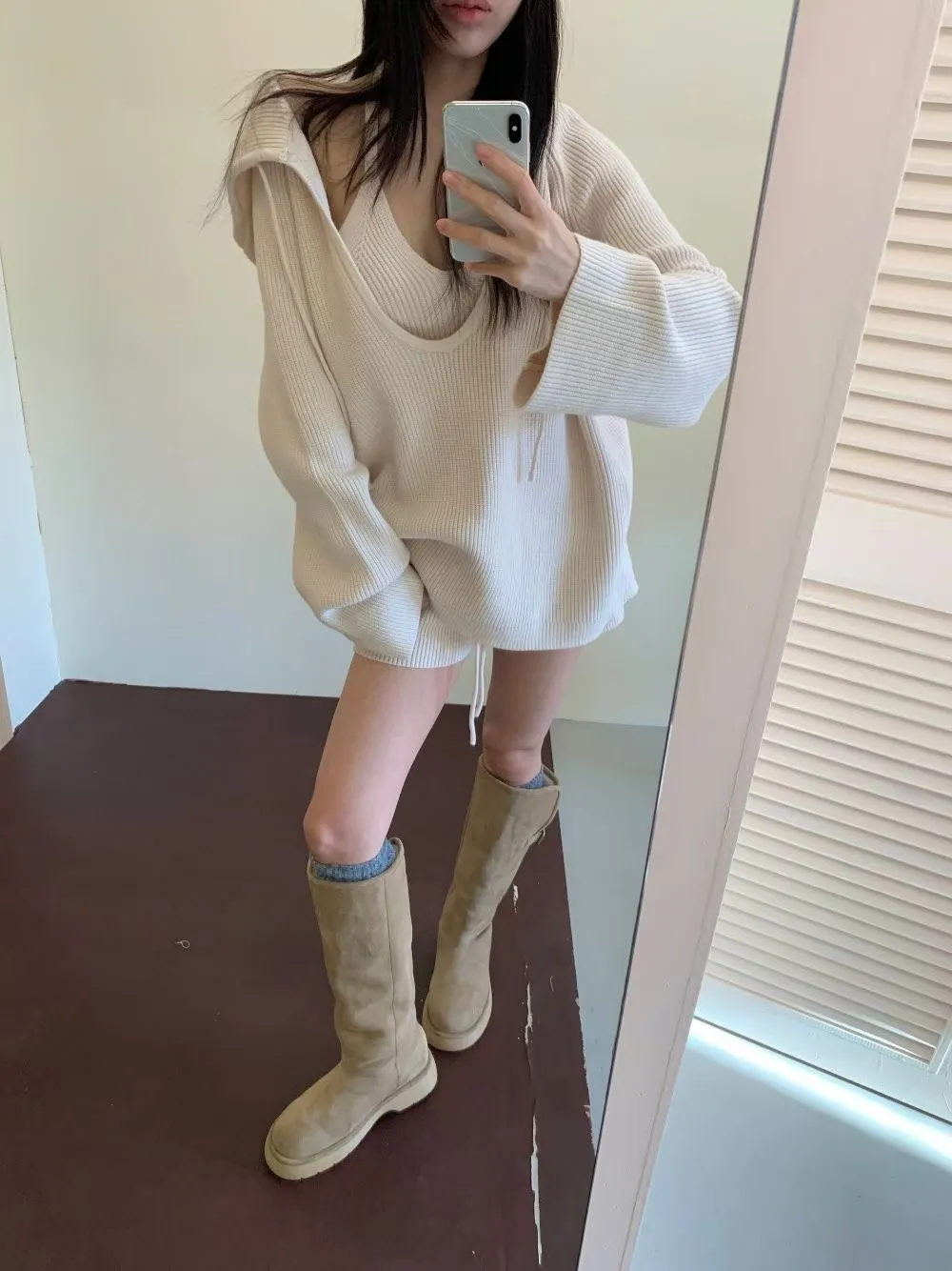 繞脖背心+連帽針織上衣+抽繩短褲套裝