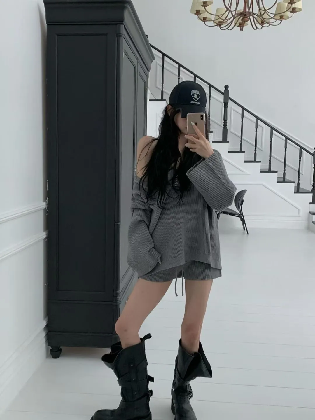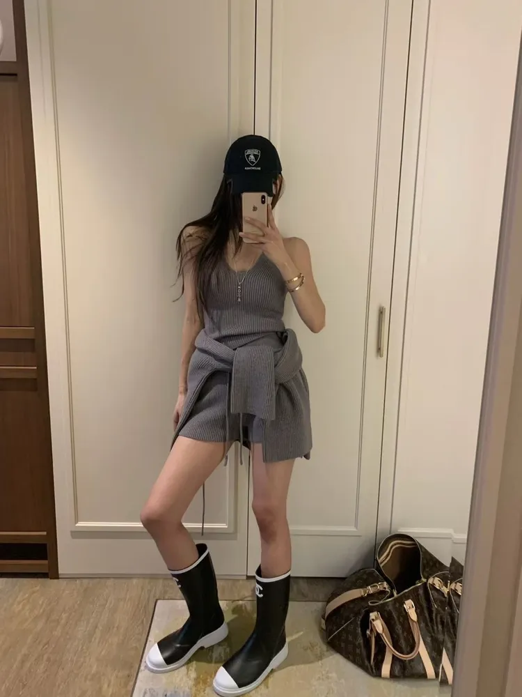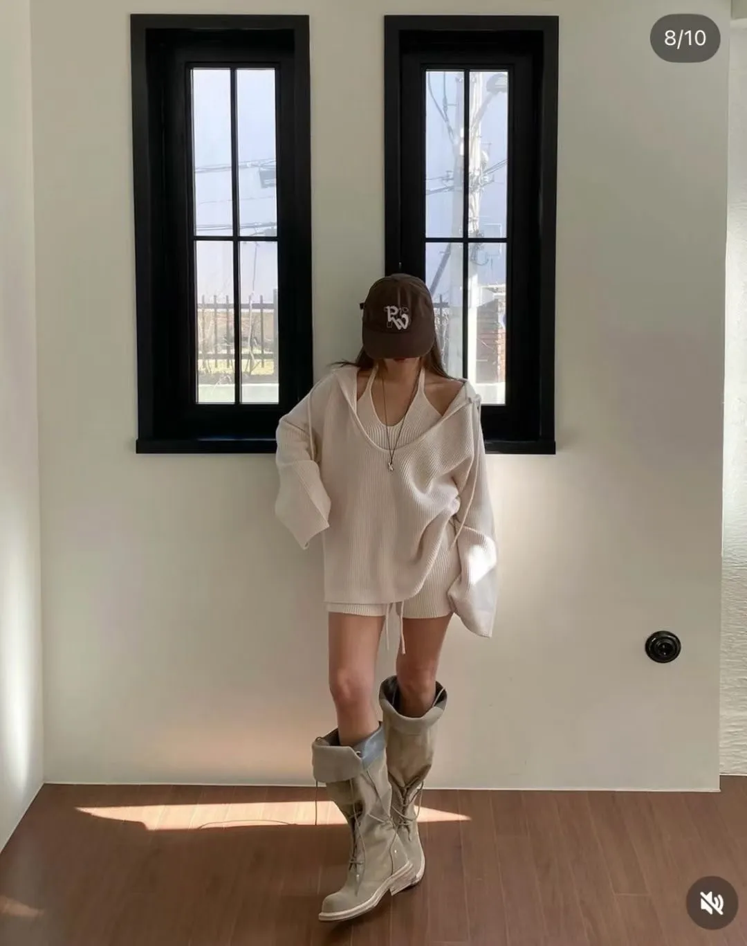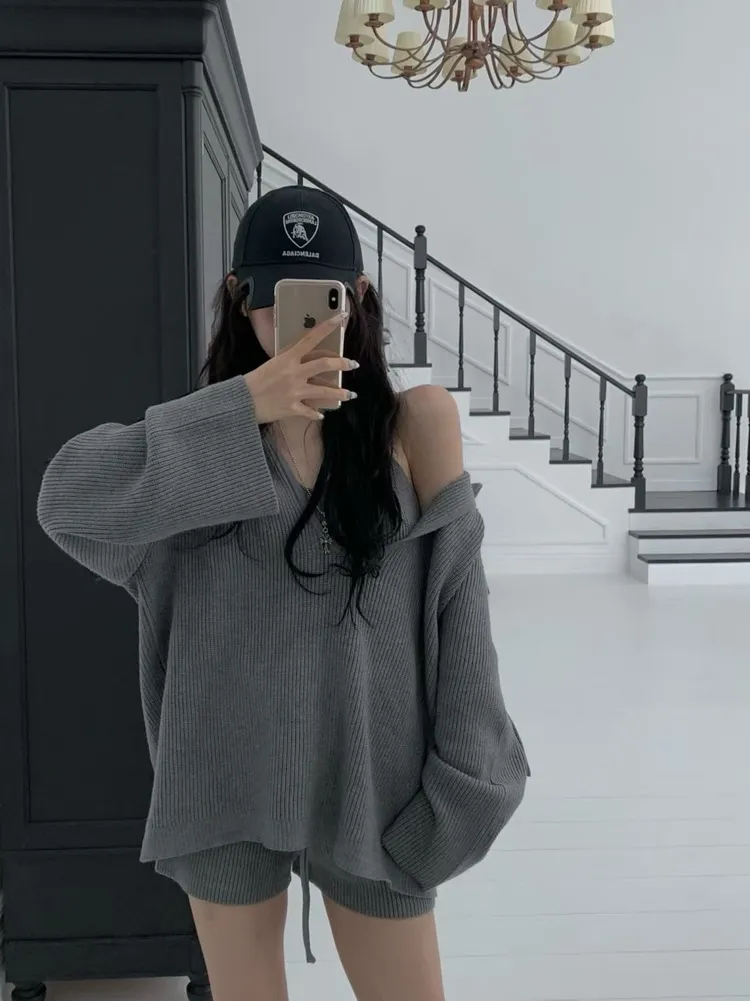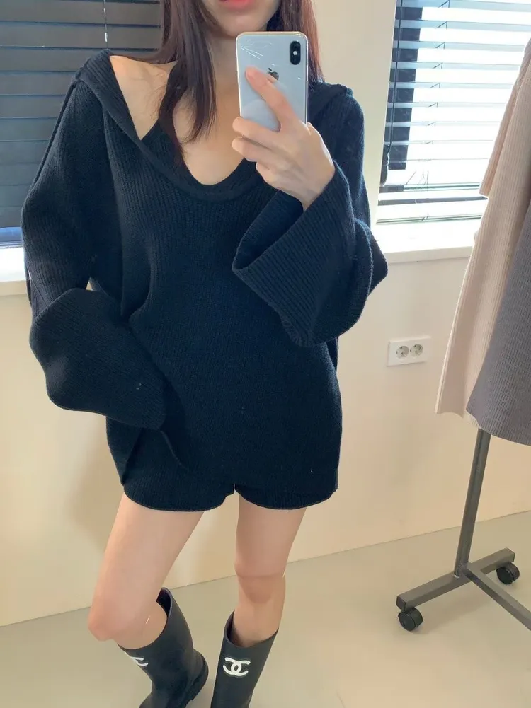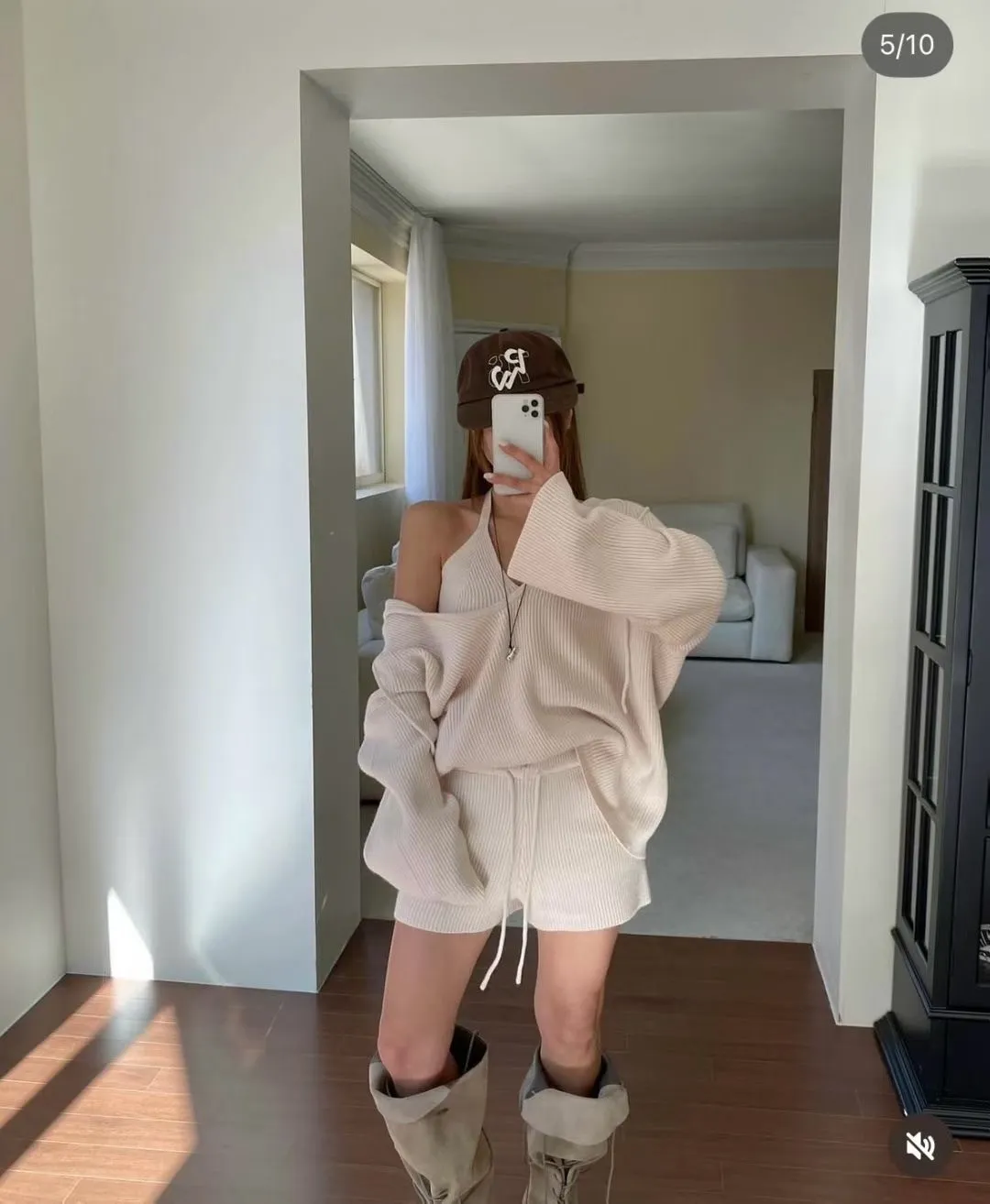 繞脖背心+連帽針織上衣+抽繩短褲套裝