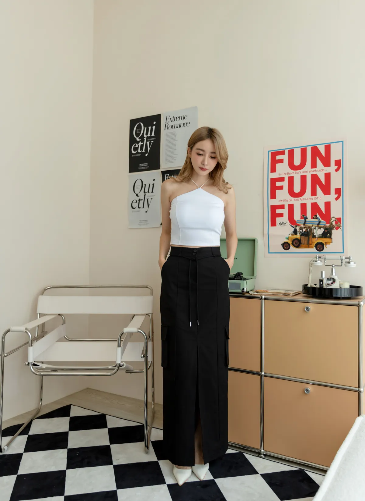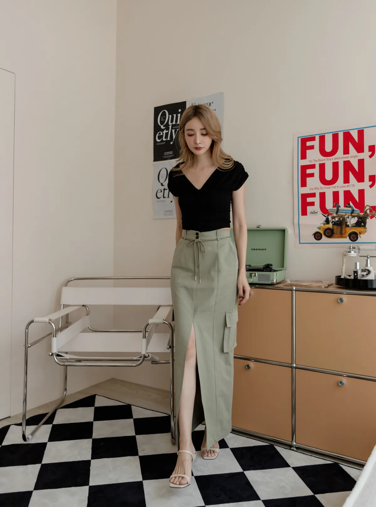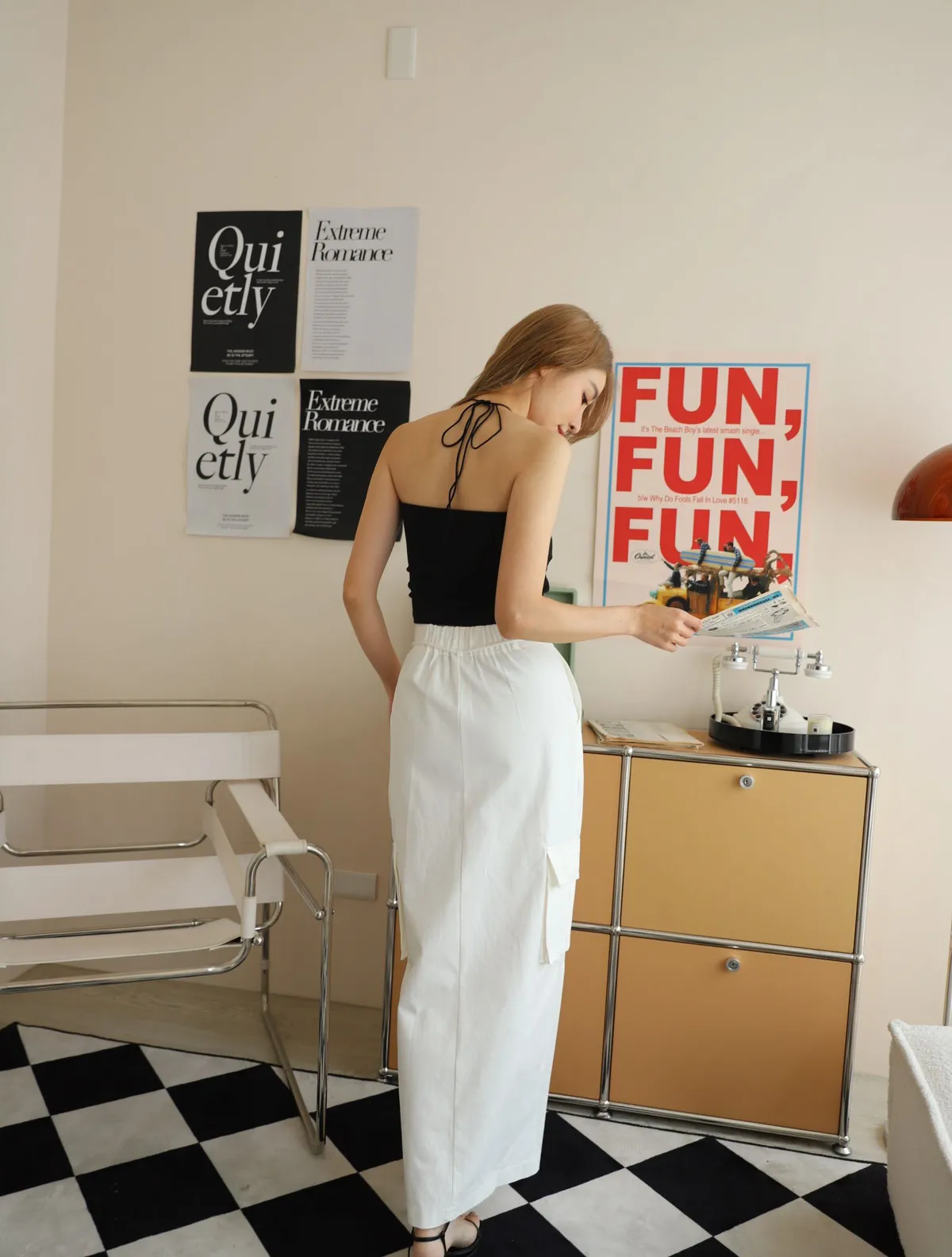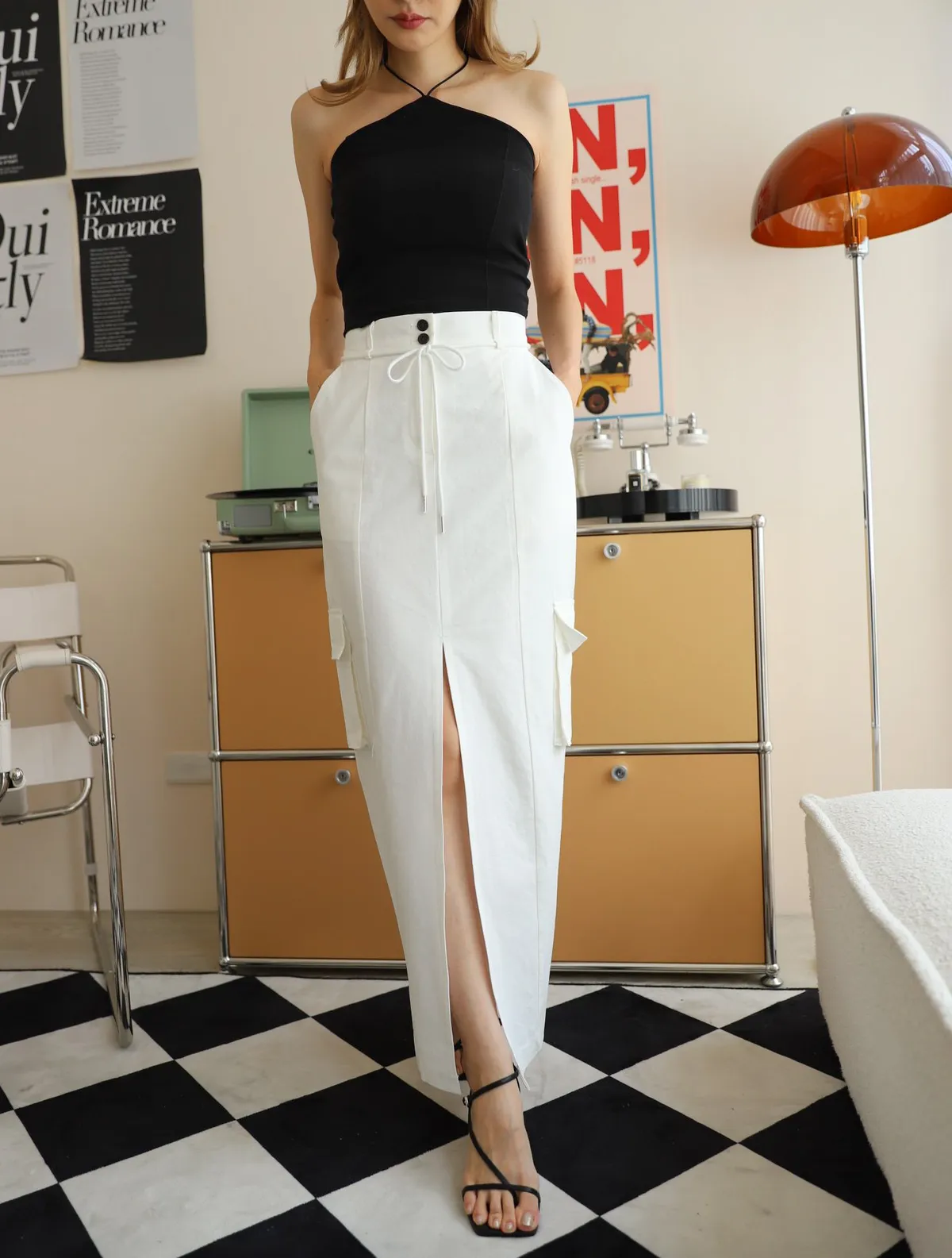 設計感顯瘦雙口袋開杈工裝裙 鬆緊長裙