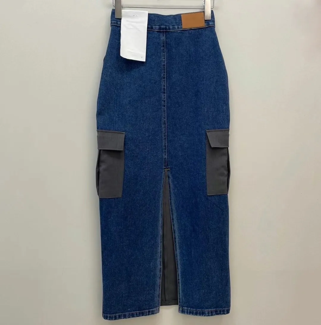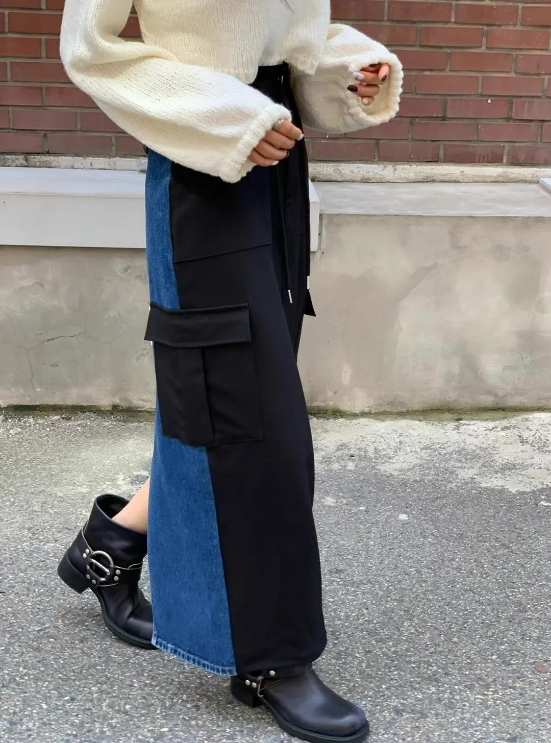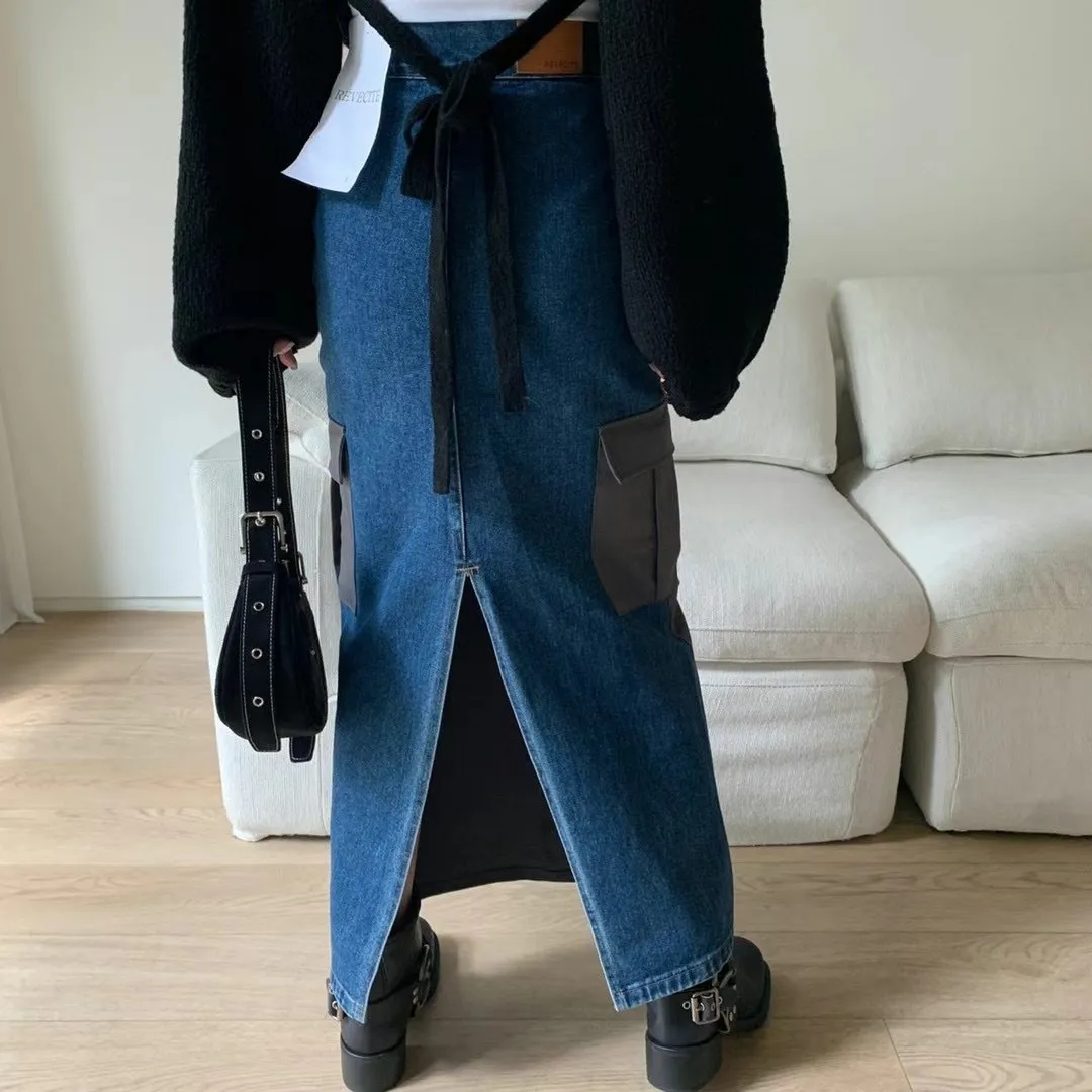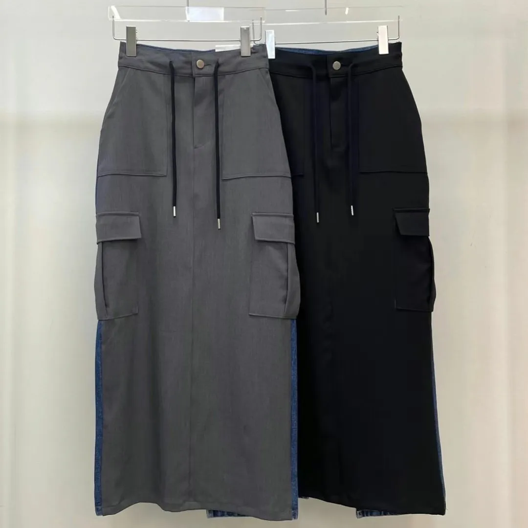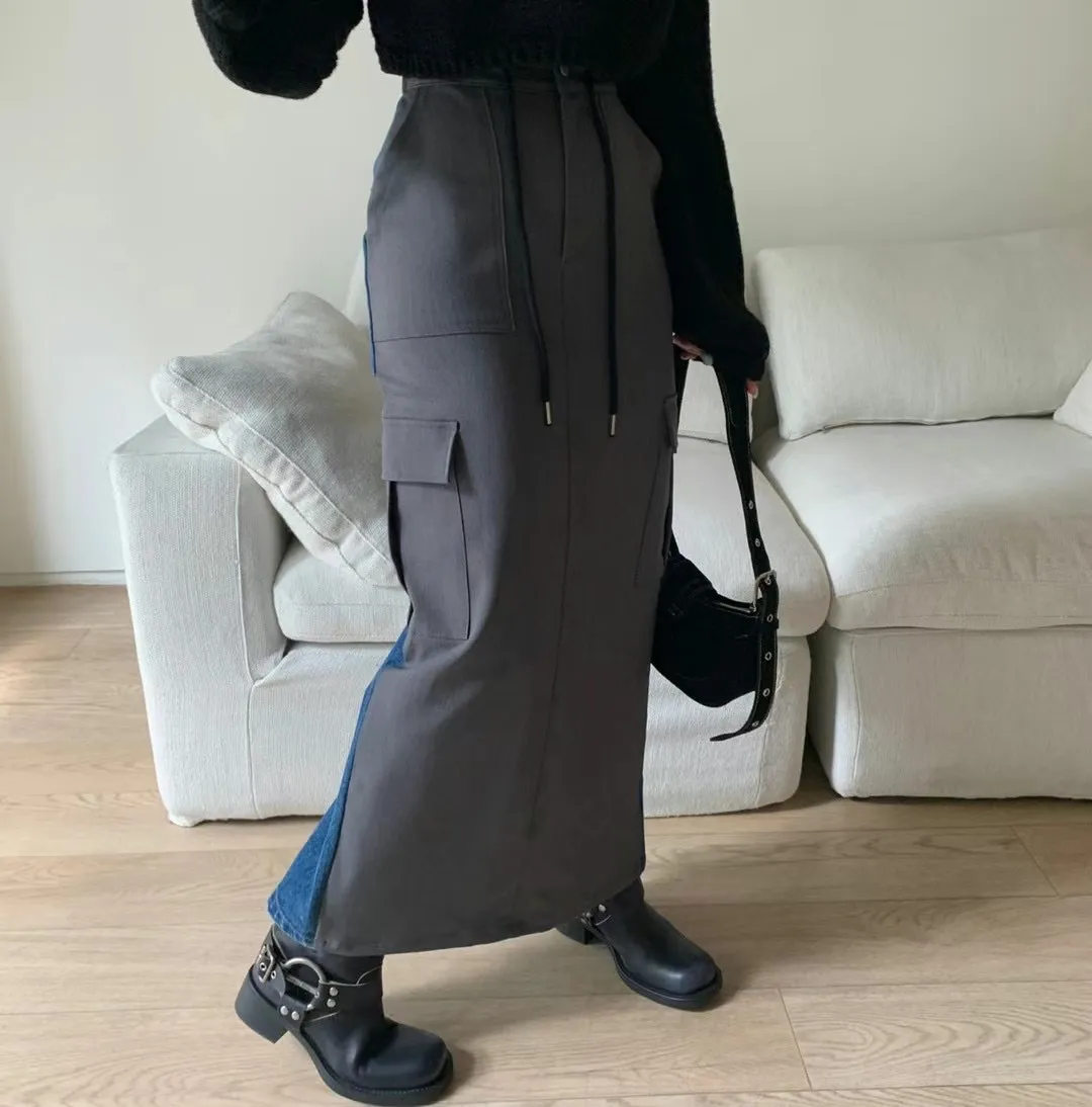 西裝牛仔拼接設計 開釦縮口高腰後開衩工裝裙 兩色 長裙 拼接設計
