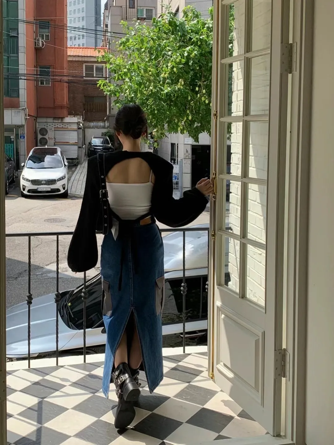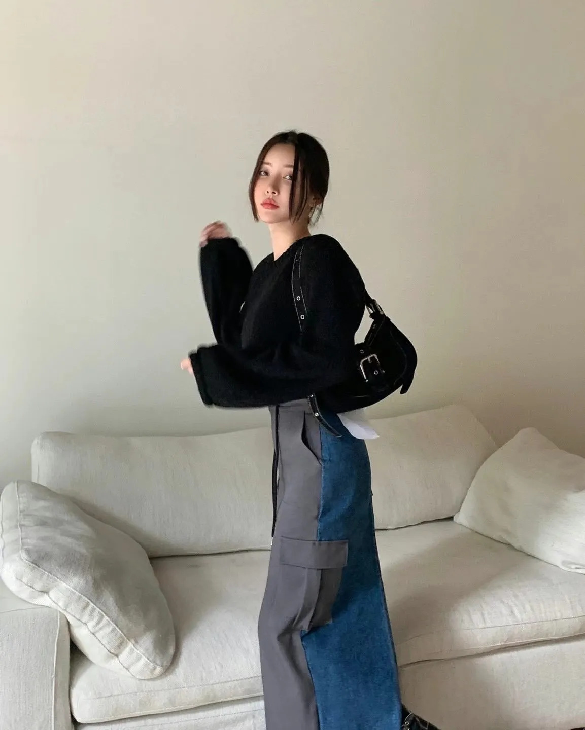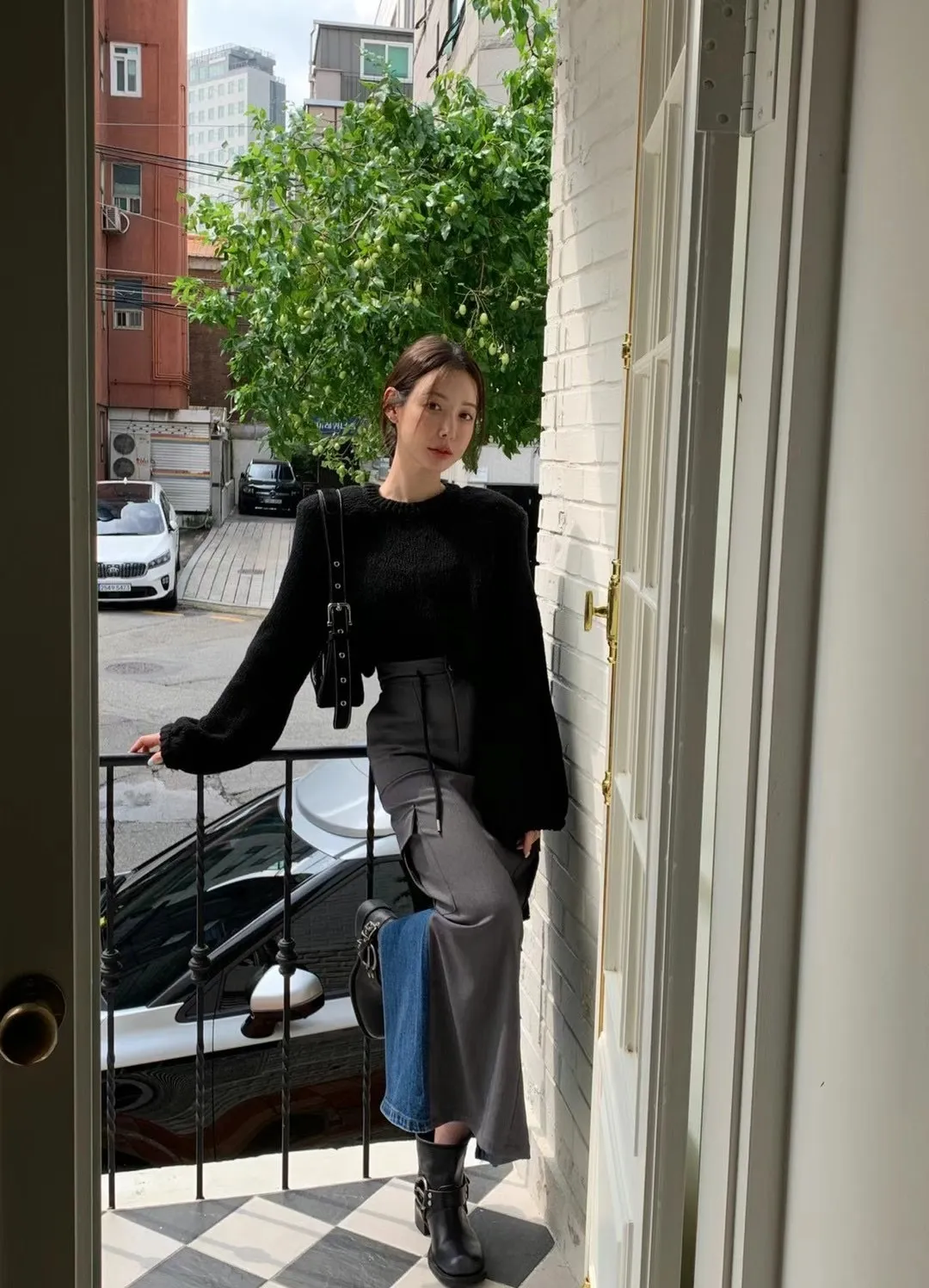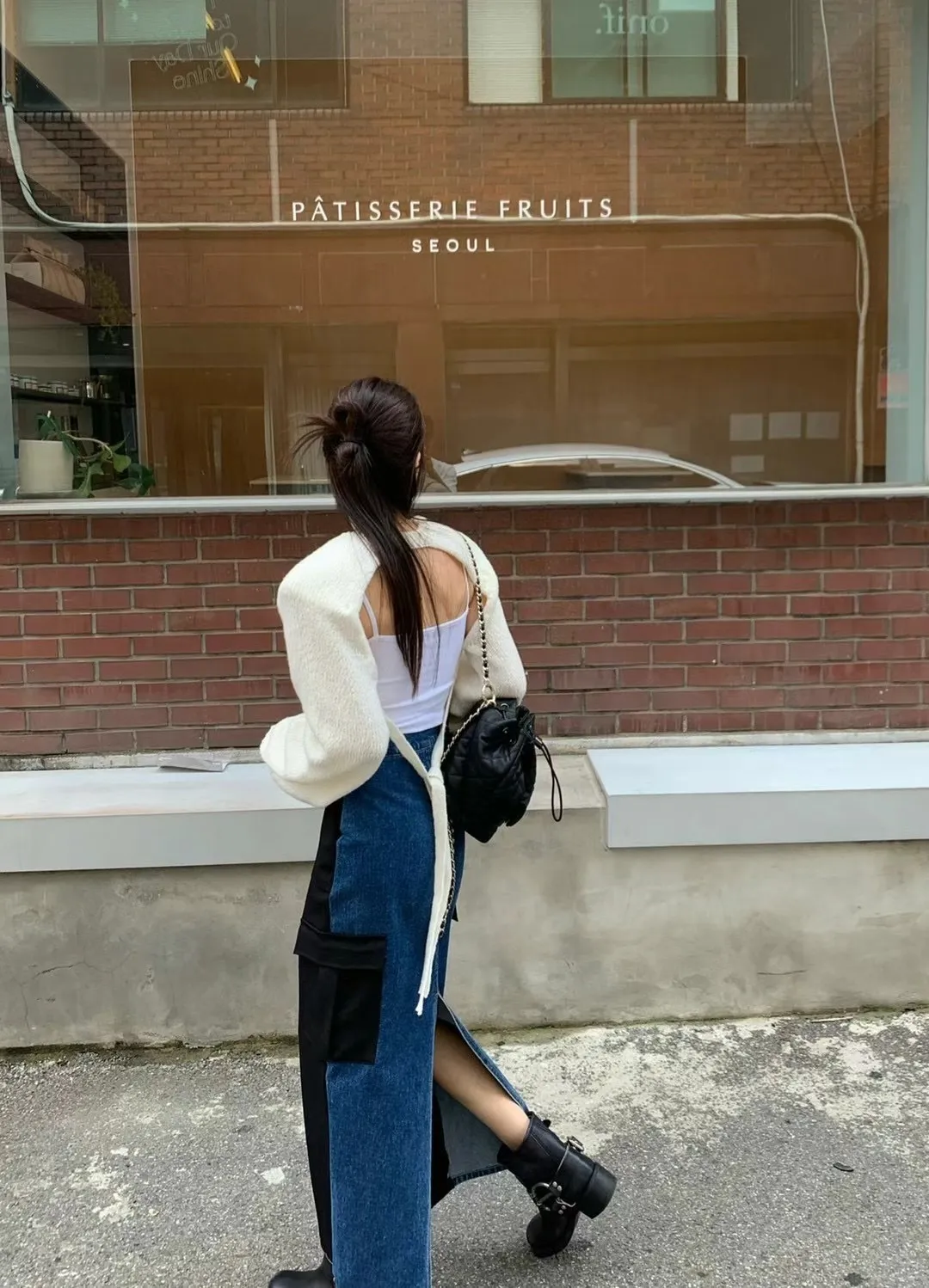 西裝牛仔拼接設計 開釦縮口高腰後開衩工裝裙 兩色 長裙 拼接設計